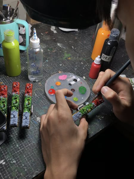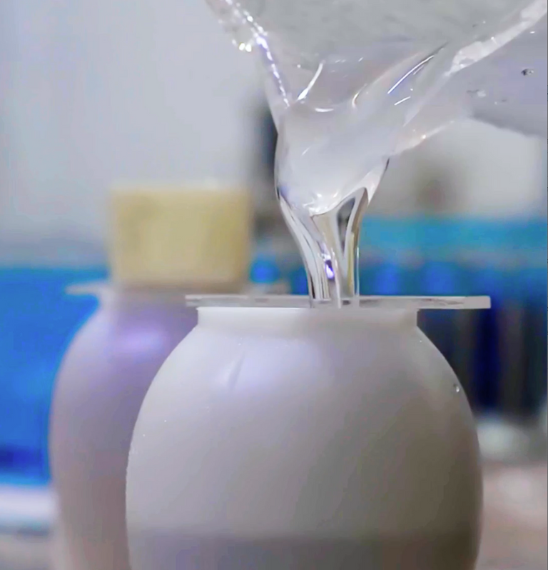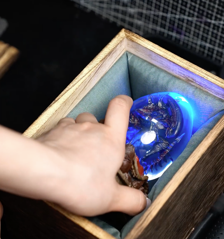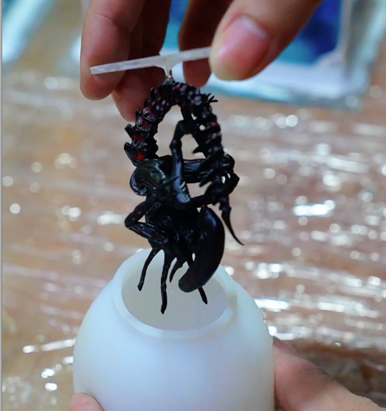 The model is carefully placed into a mold, and clear epoxy resin is poured over it. This step is incredibly delicate—any bubbles or imperfections mean we start all over again.