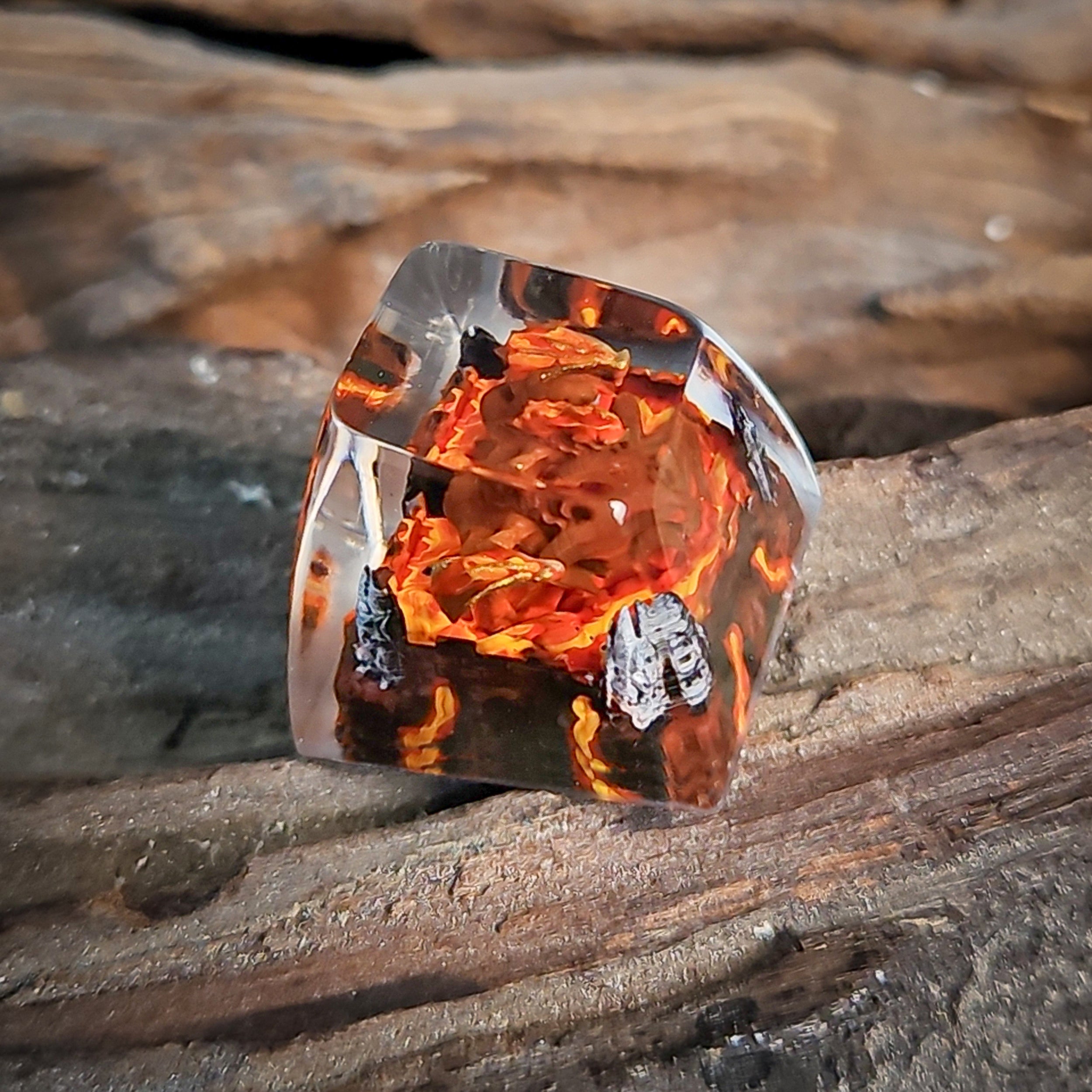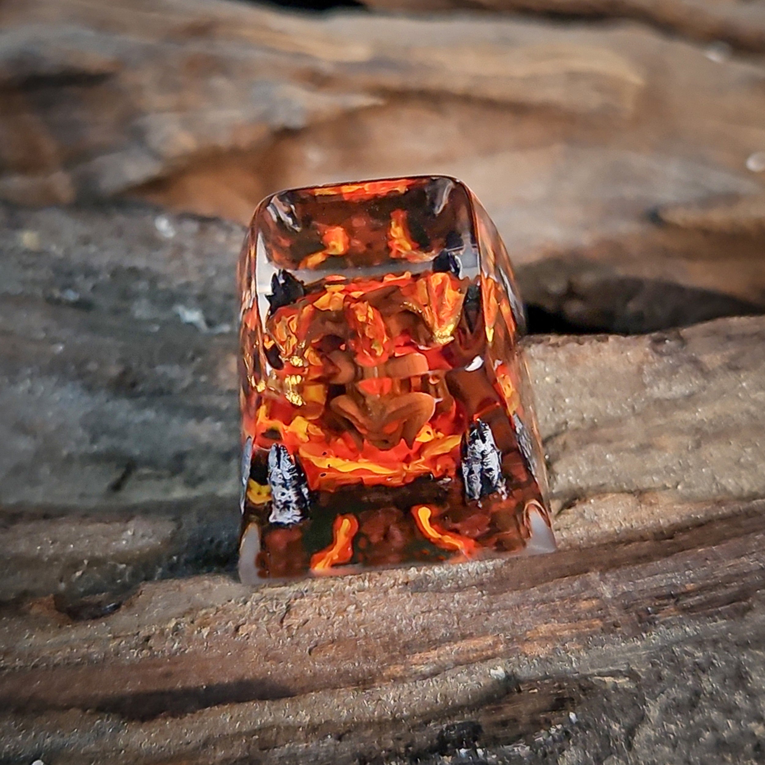 Behind the Balrog’s molten features, flames swirl in shades of crimson, orange, and gold, mimicking the burning abyss from which it rose. The layered resin adds depth and motion, making the flames appear alive, as though the creature is shifting within the keycap itself. Subtle shadows and cracks in the backdrop evoke scorched stone, adding to the hellish atmosphere.
