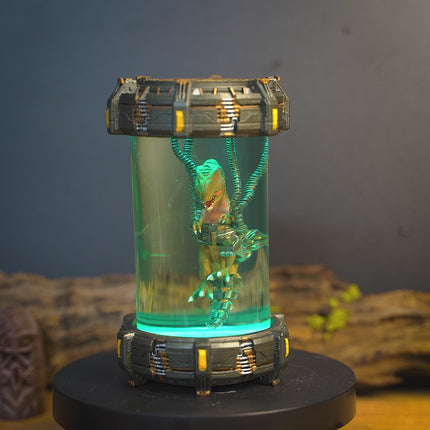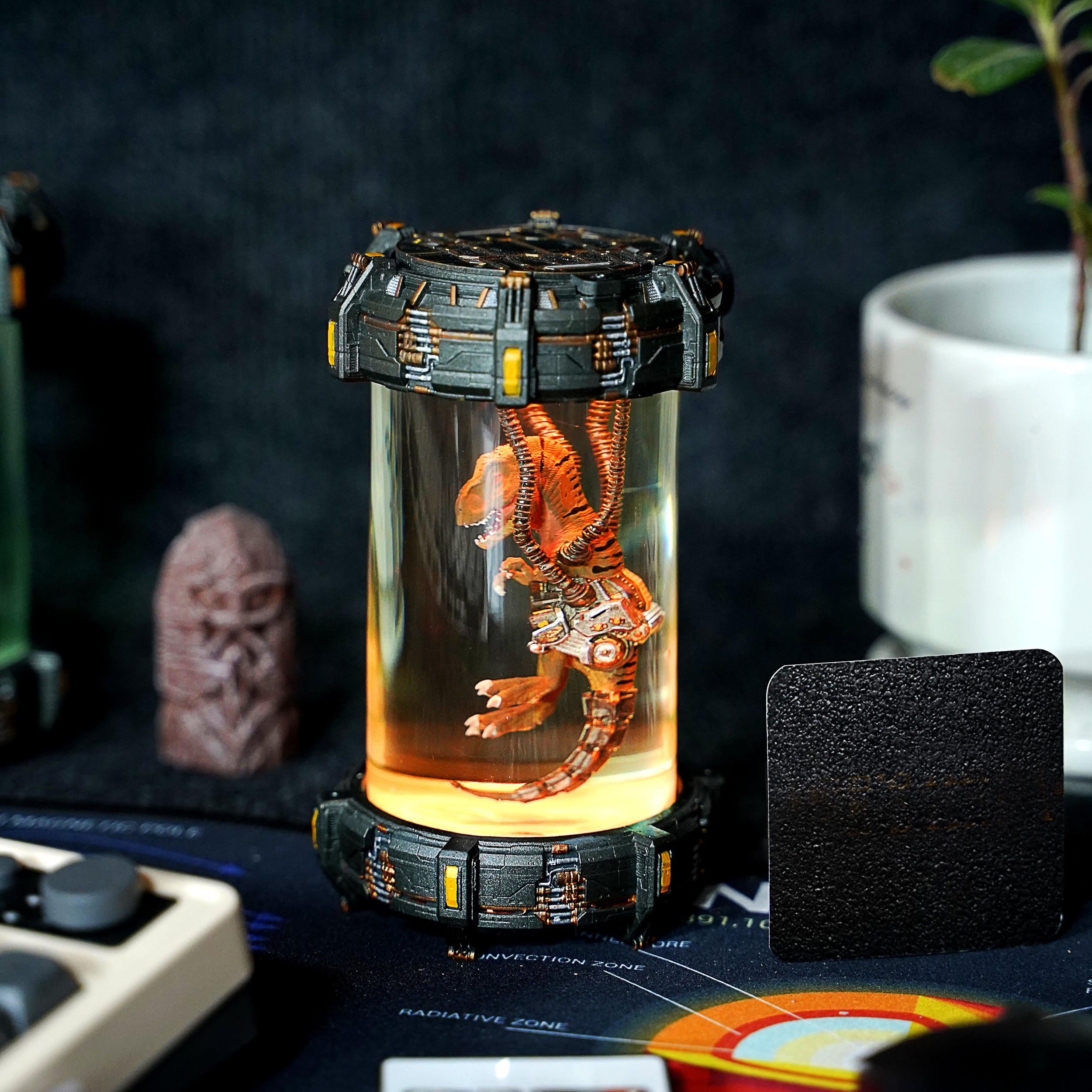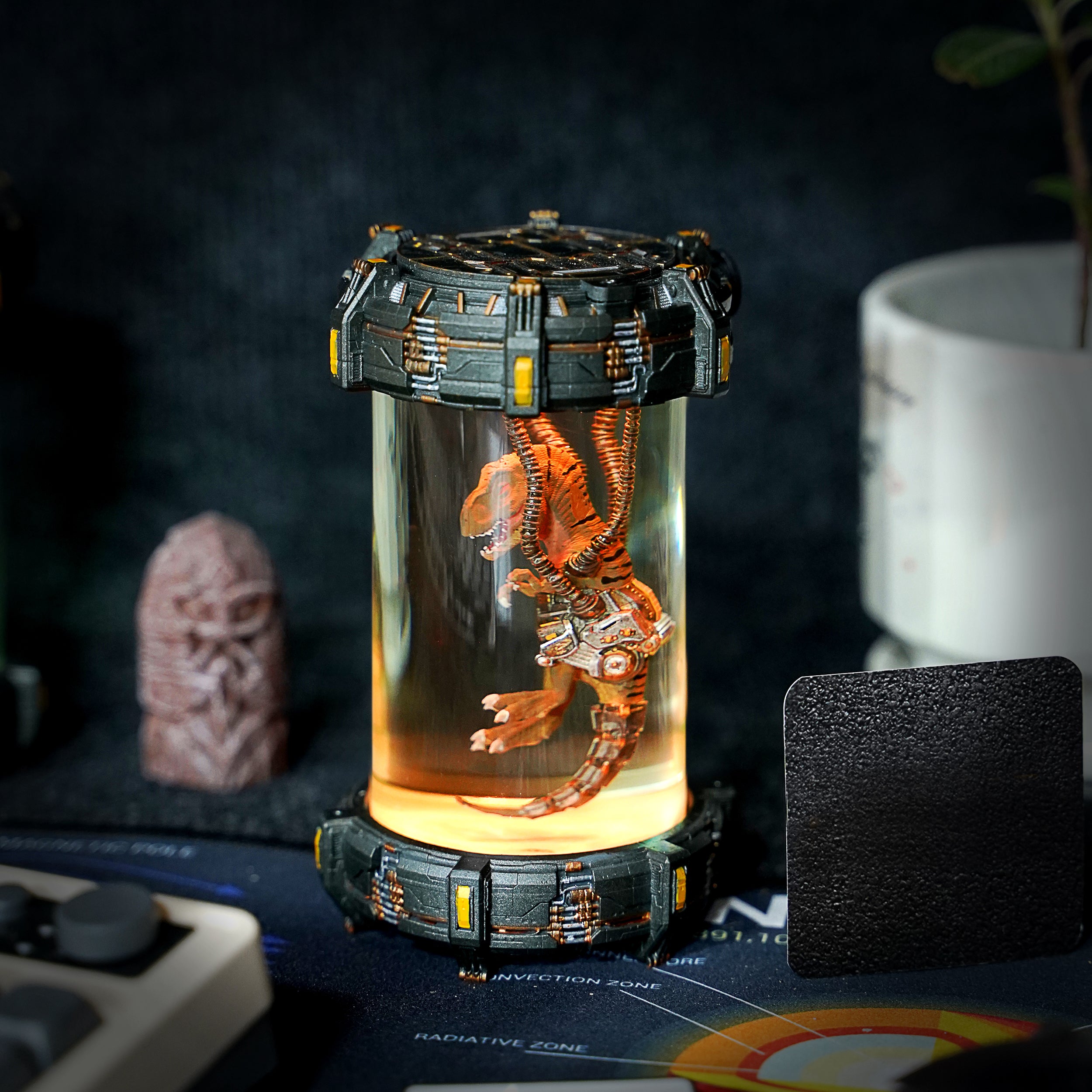 T-Rex V2 features a redesigned biolab pod with high-tech elements in the base, simulating a dystopian research facility. A lamp for those who love cinematic storytelling through design.