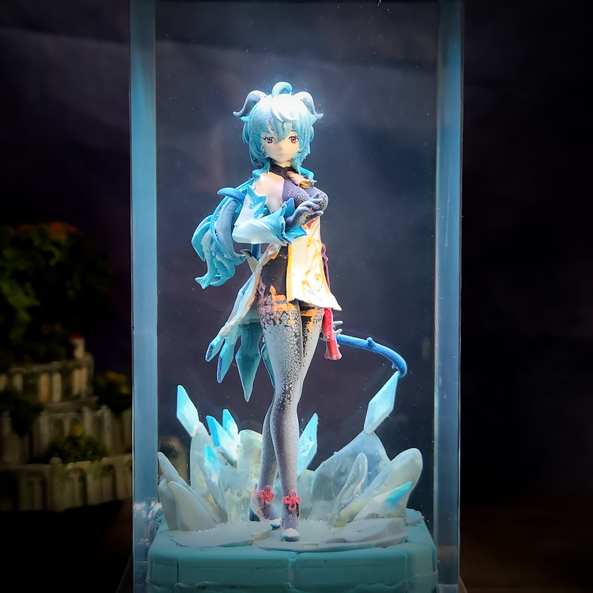 Featuring the half-qilin secretary of the Liyue Qixing, the Ganyu Resin Lamp reflects her calm and gentle spirit. The intricate details of her attire and horns are carefully rendered, creating a stunning visual that emits a warm and magical light.