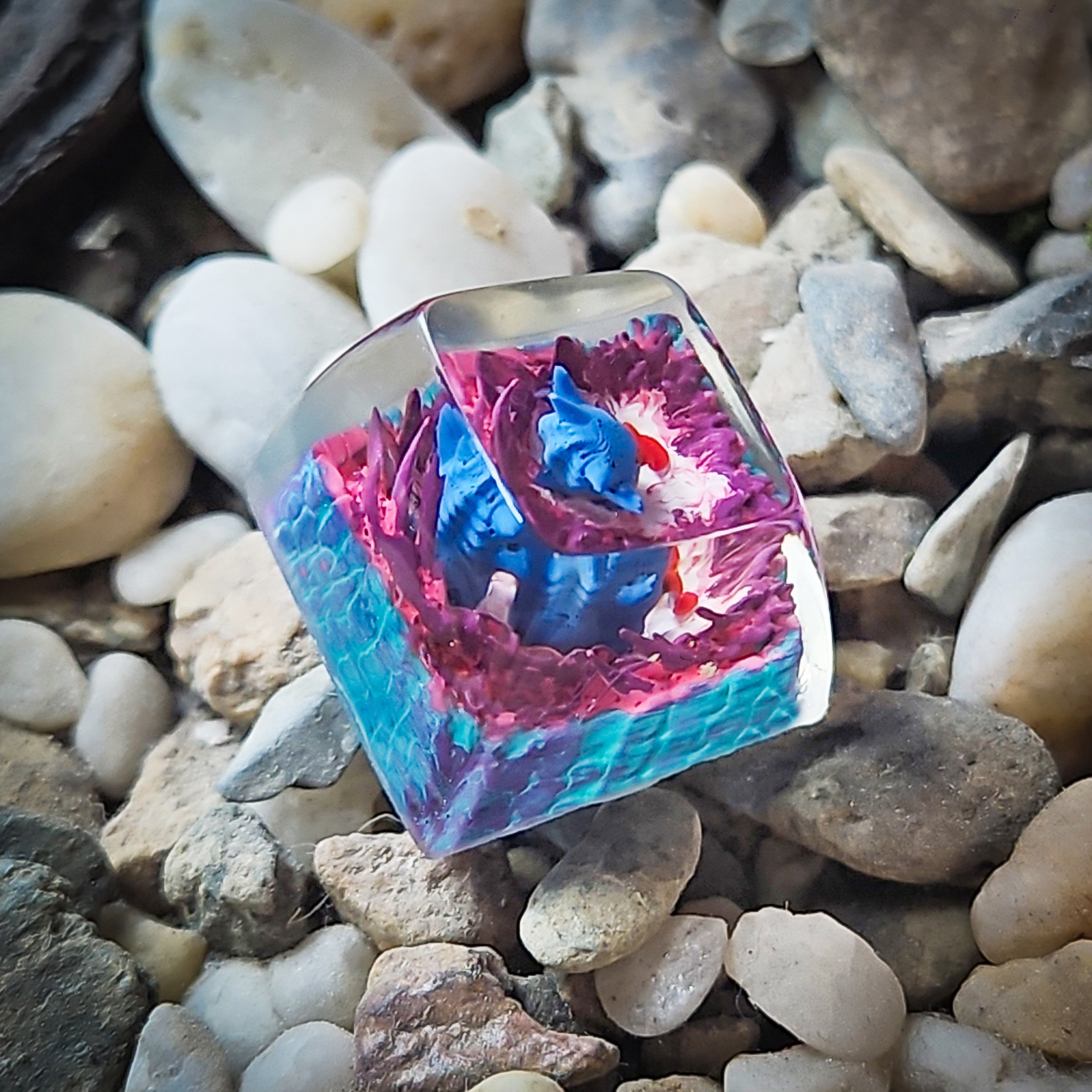 The keycap captures Gengar’s signature wide grin and glowing eyes, sculpted with precision inside the clear resin to highlight its mysterious and playful nature. Darker hues and subtle shading enhance the ghostly vibe, making it a striking addition that stands out on any keyboard.