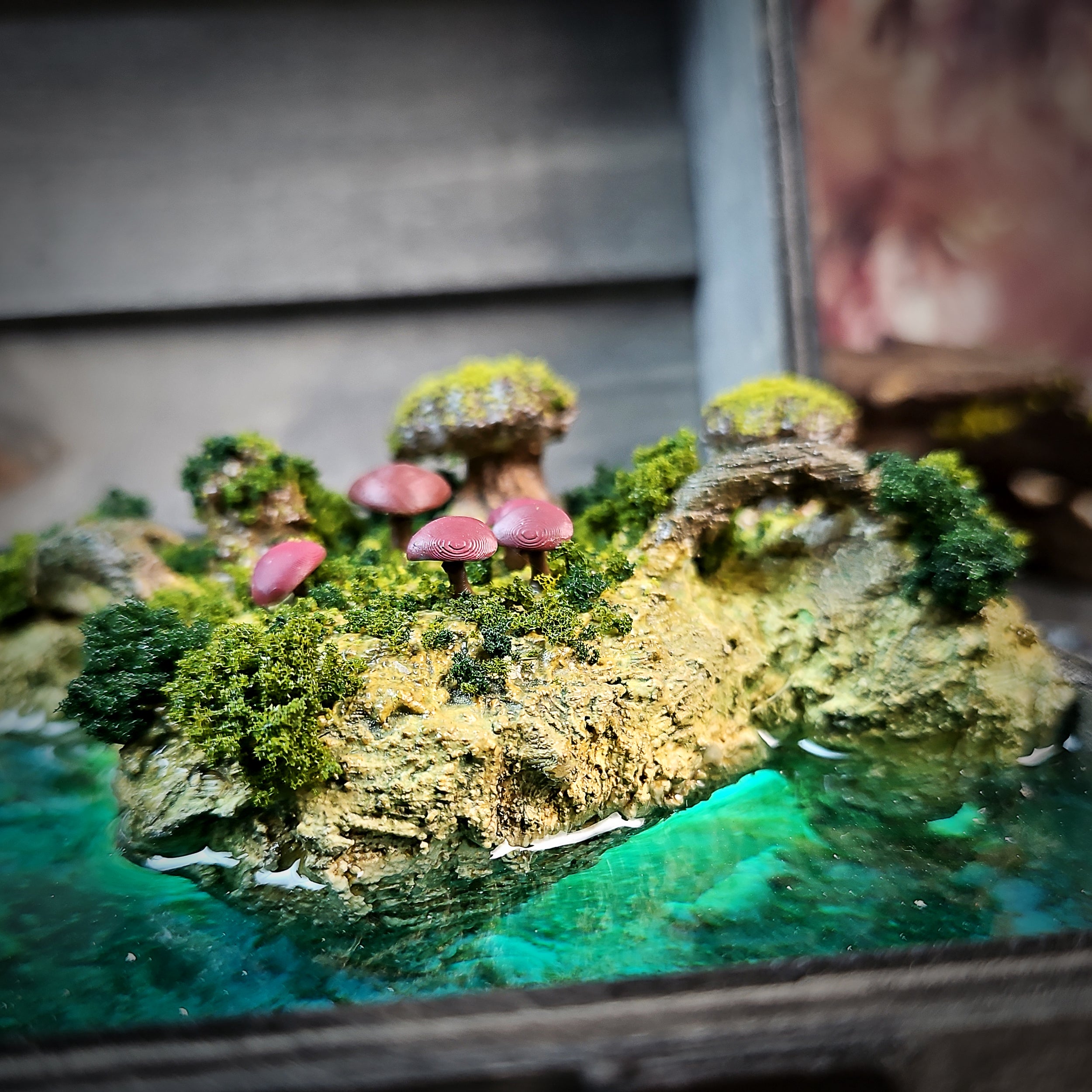 Miniature scene elements such as trees, figures, or buildings are handcrafted from resin using silicone molds or sculpted manually. These pieces are also painted and detailed to match the overall composition and bring the miniature world to life.