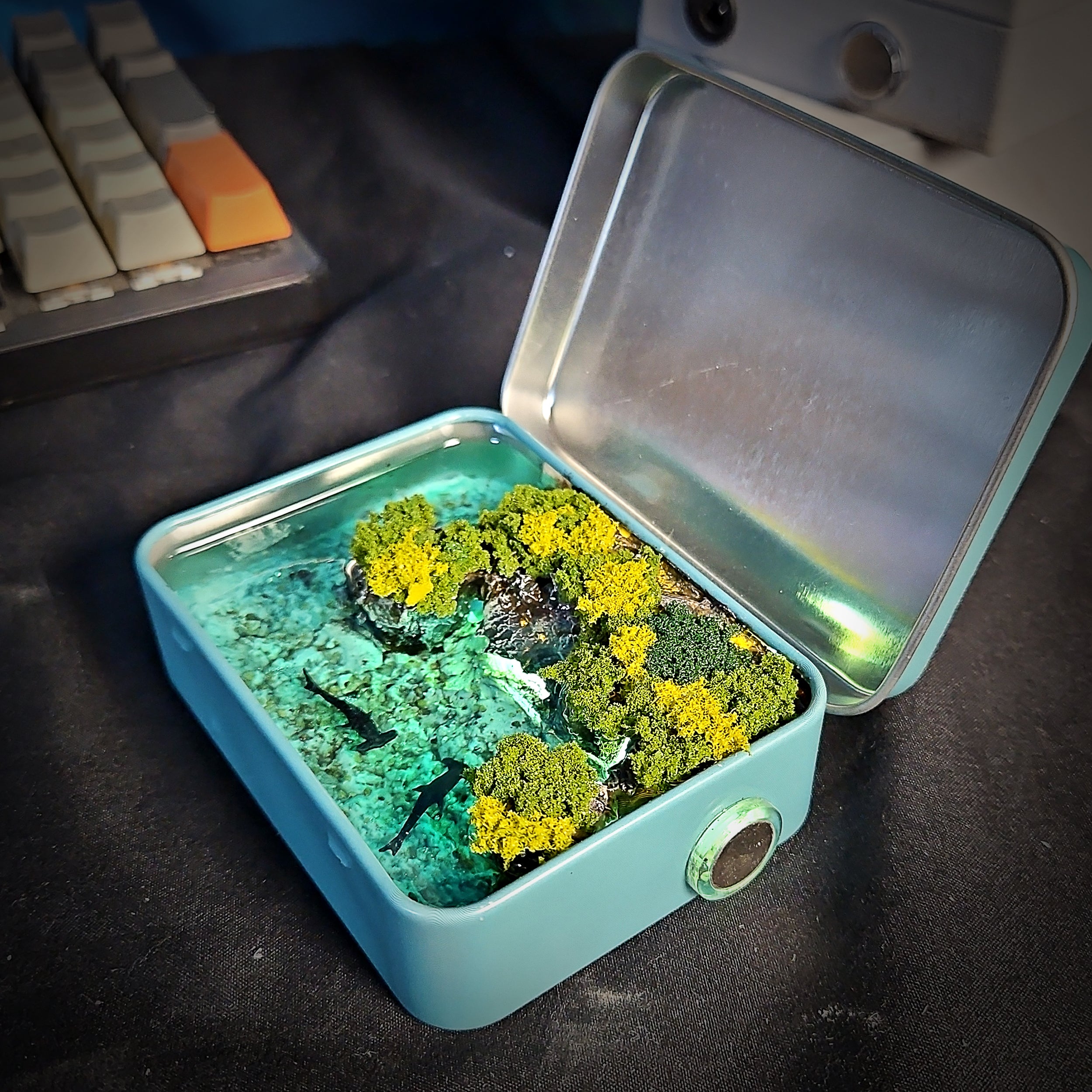 Miniature scene elements such as trees, figures, or buildings are handcrafted from resin using silicone molds or sculpted manually. These pieces are also painted and detailed to match the overall composition and bring the miniature world to life.
