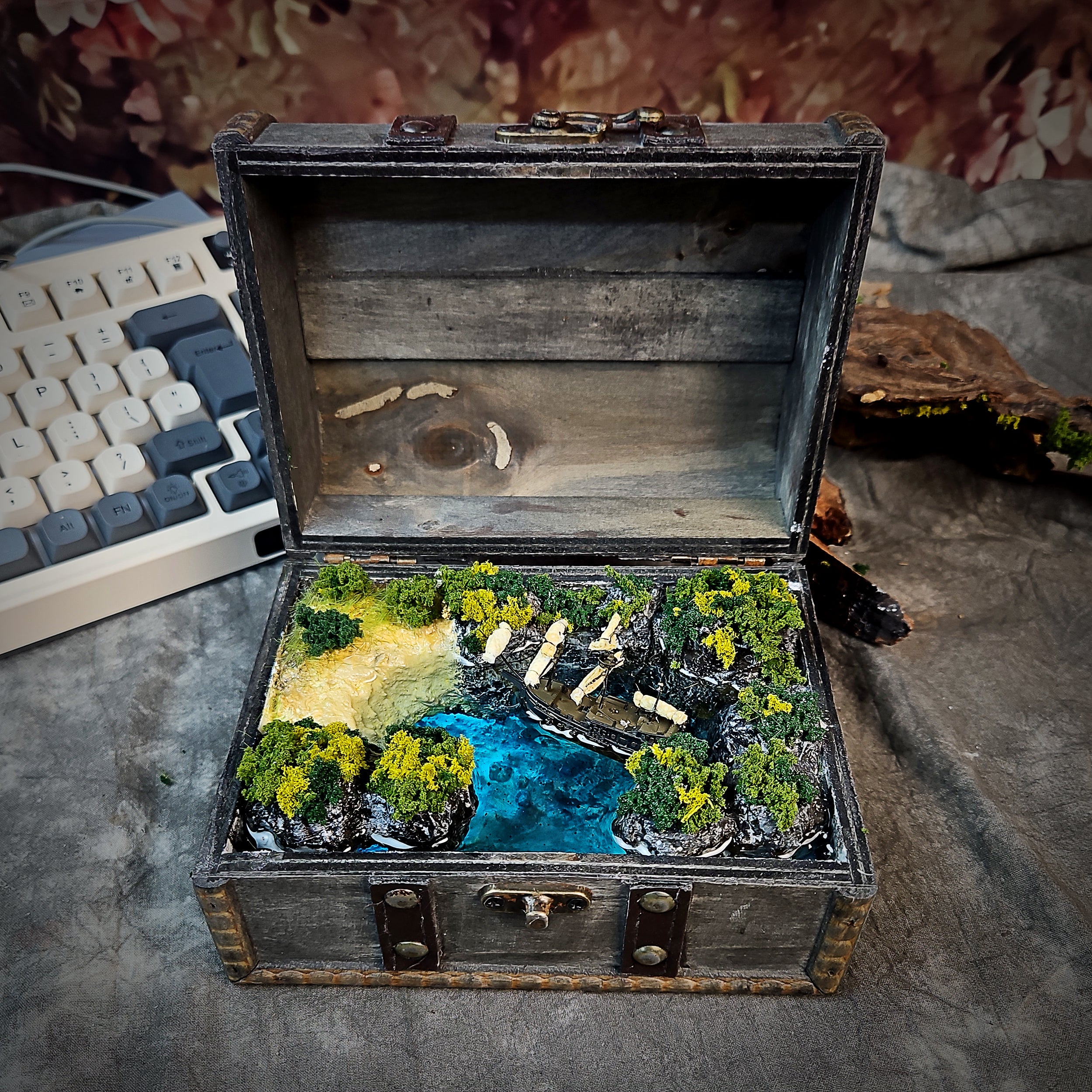 Imagine a tranquil cove bathed in the soft glow of twilight, the gentle lapping of waves against the shore, and the shadowy silhouette of a pirate ship anchored just offshore. Our artisans have painstakingly captured this scene within a crystal-clear resin box, creating a mesmerizing tableau that will transform any room into a nautical haven.