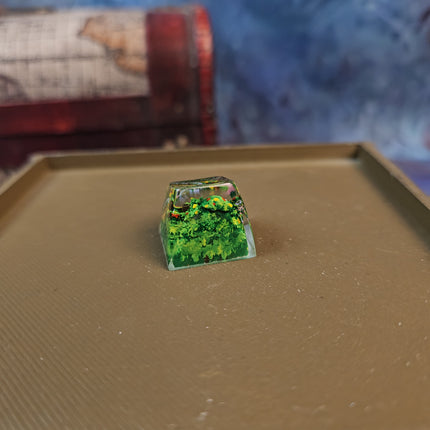 The natural textures and soft, earthy tones — from the mossy greens to warm browns and muted yellows — create a scene that feels alive and welcoming. The layered resin adds dimension, making it feel like you’re peeking into a slice of Middle-earth itself. When light shines through, the keycap glows gently, enhancing the illusion of morning sun falling across Bag End.