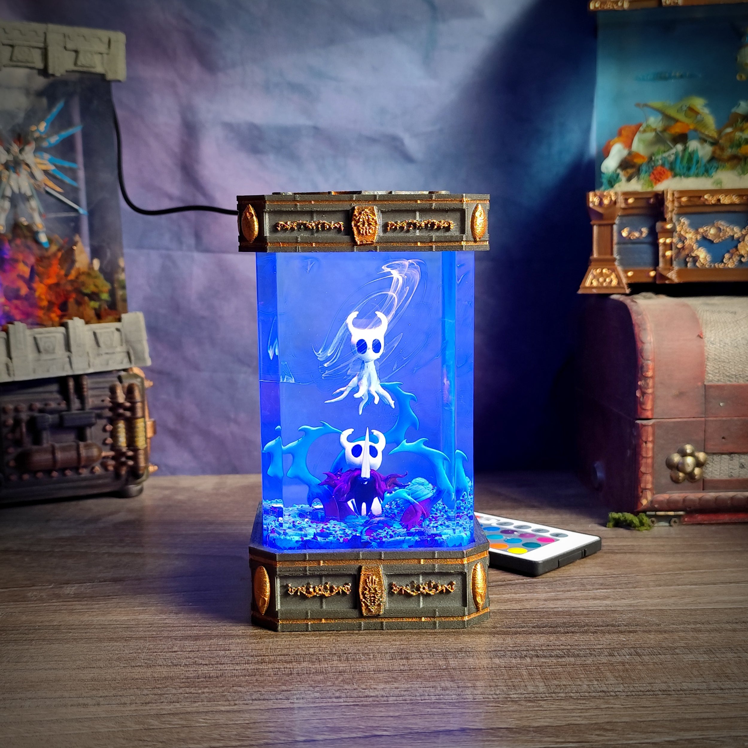 Step into the world of Hollow Knight with this stunning handmade resin lamp featuring The Knight in an epic glowing scene. Designed with precision and artistry, this collectible diorama captures the spirit of Hallownest through vivid blue lighting and intricate sculpting details.