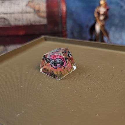 Set against a subtle jungle-themed backdrop with hints of dark greens and earthy browns, the keycap evokes the wild, untamed spirit of Kong’s domain. The layered resin adds depth and dimension, enhancing the sense of movement and raw strength contained within this tiny masterpiece. When light hits the resin, the textures and colors come alive, creating a dynamic effect.
