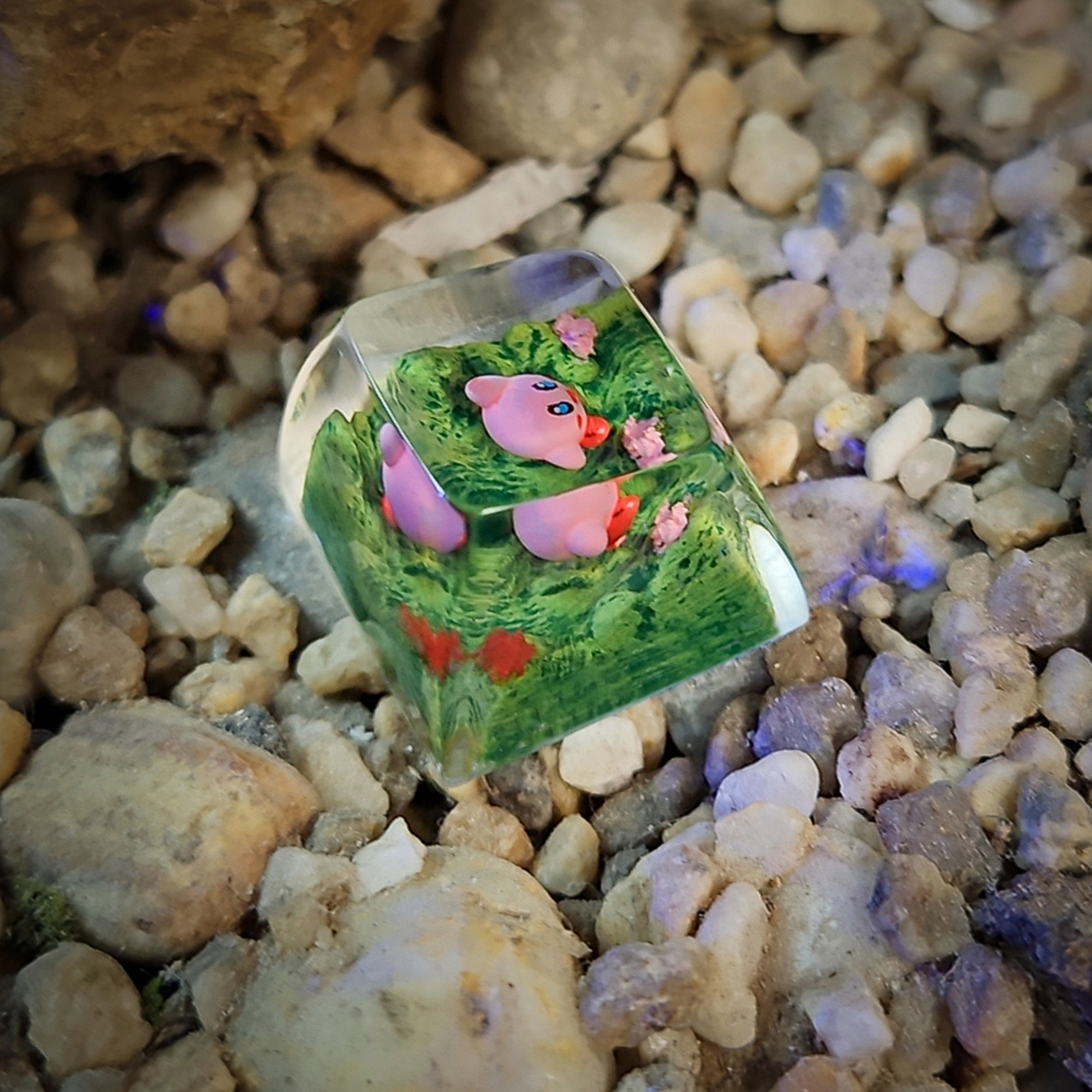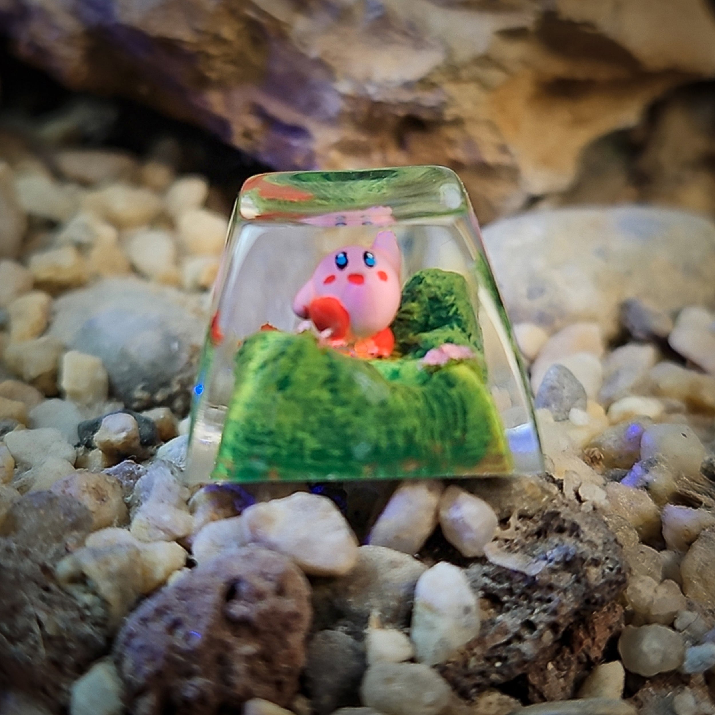The background features soft pastel colors and subtle star motifs, reflecting Kirby’s whimsical world and magical adventures. The layered resin adds depth and a slight shimmer, making Kirby appear as if he’s ready to float off the keycap and into your game. The smooth finish enhances the overall cuteness and tactile appeal of this miniature masterpiece.