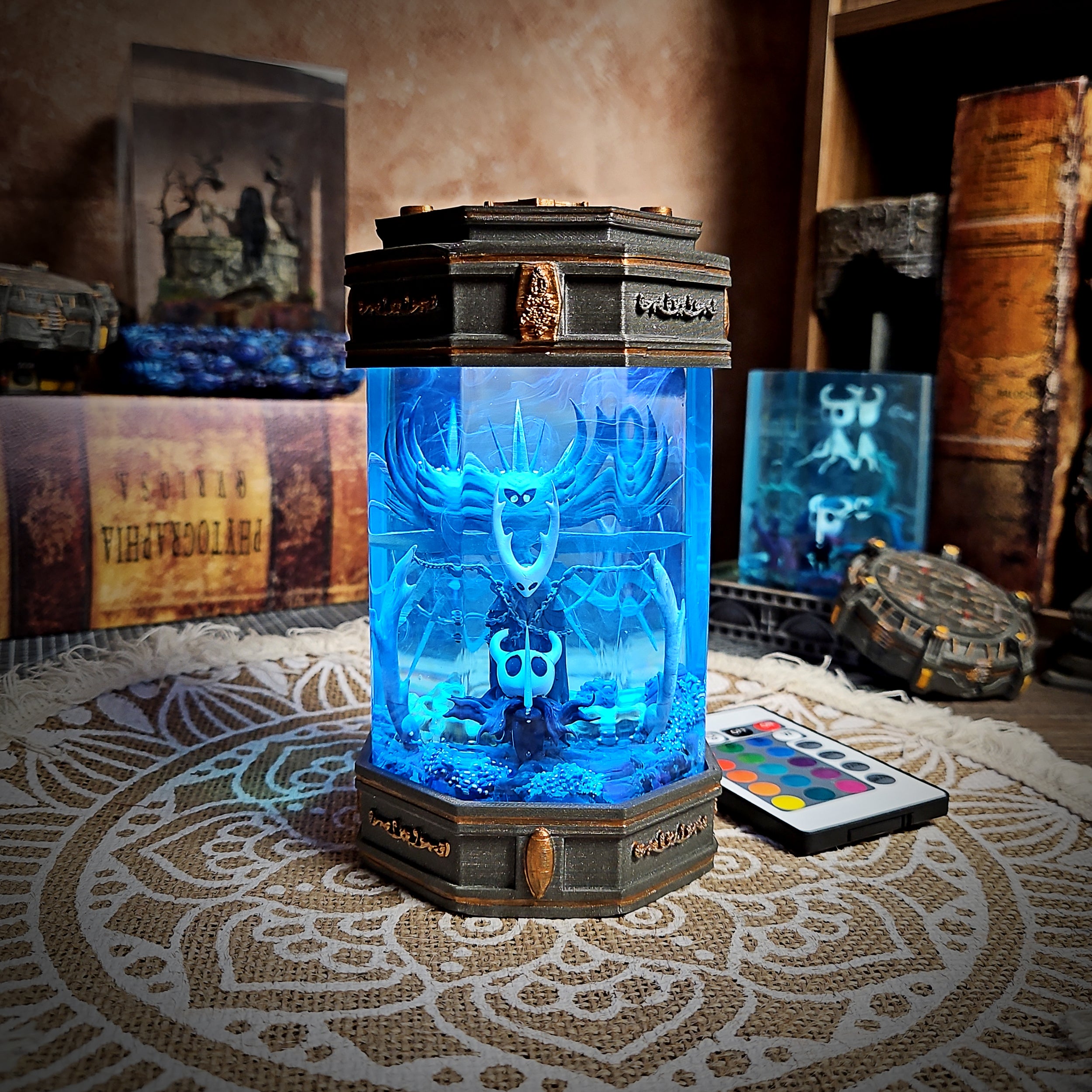Handmade Craftsmanship: Each lamp is carefully sculpted and assembled by hand for a unique finish. - Immersive Blue Glow: Features The Knight surrounded by ethereal light effects, inspired by the Hollow Knight universe.