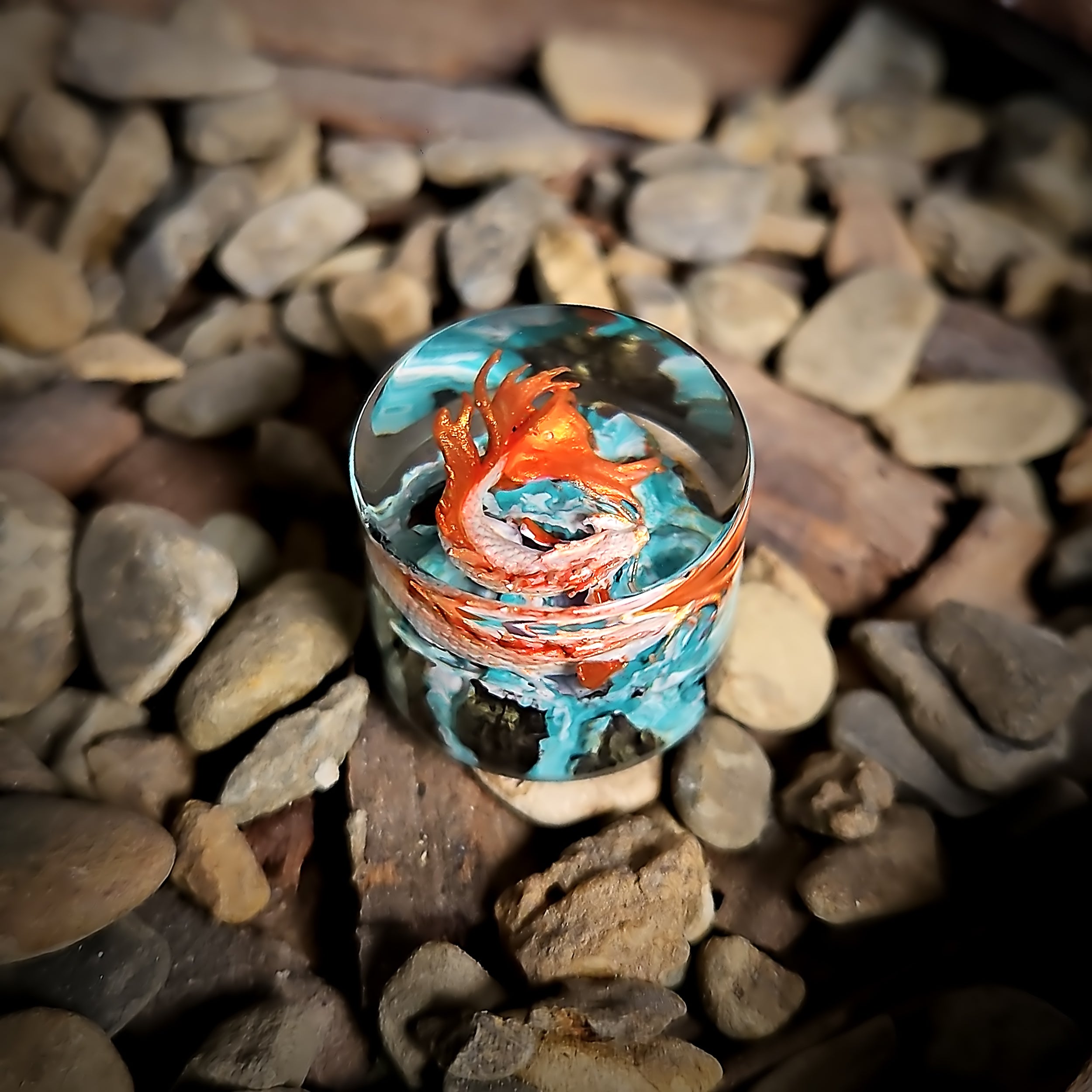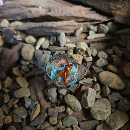 Encased within a crystal-clear resin dome, the Dragon Koi appears to swim through swirling water currents, created with layered shades of blues and whites that add depth and motion. The glossy resin finish enhances the shimmering scales and fluid lines, making the miniature aquatic scene vibrant and dynamic. Each turn of the knob reveals new angles of this exquisite work of art, immersing you in the lore and beauty of the Dragon Koi.