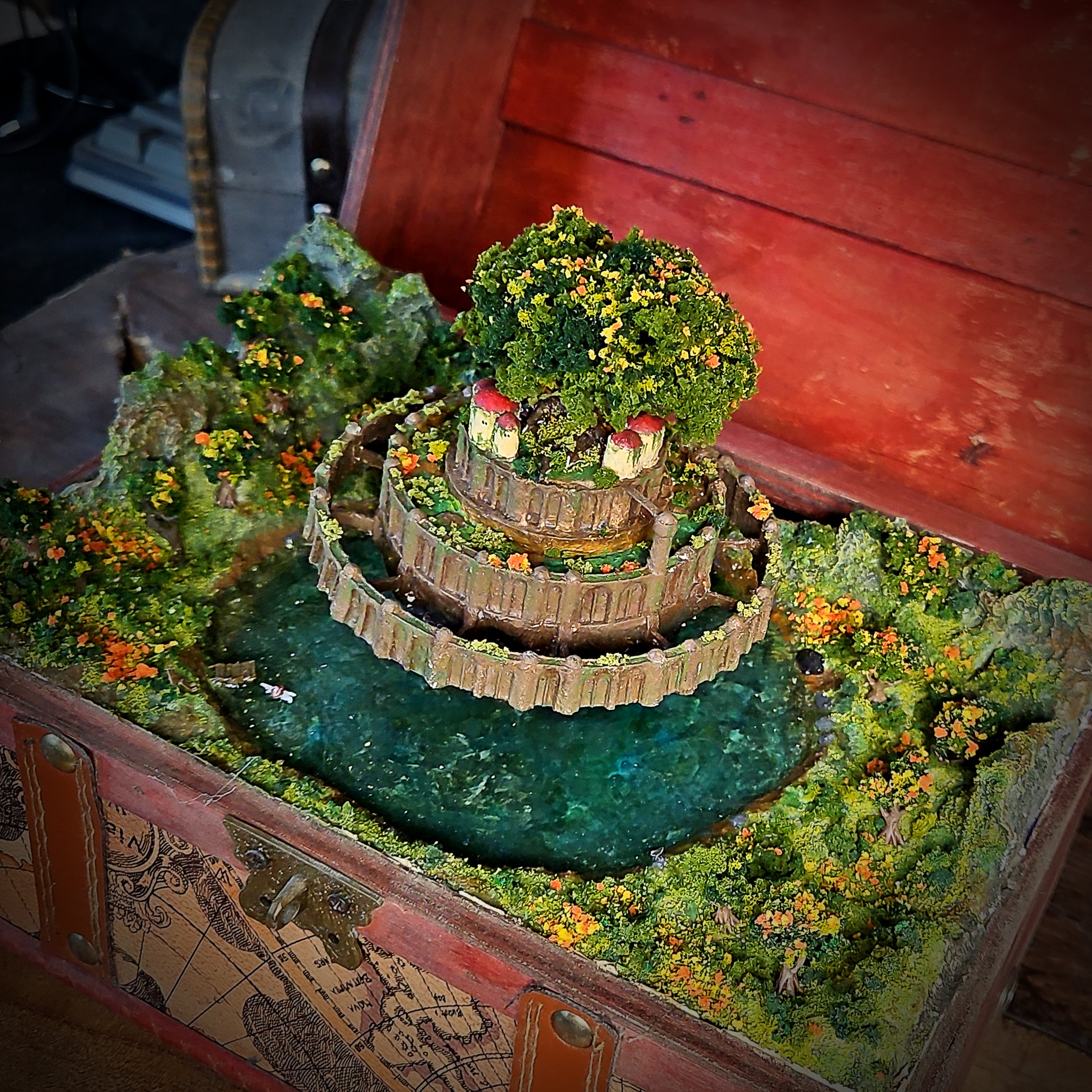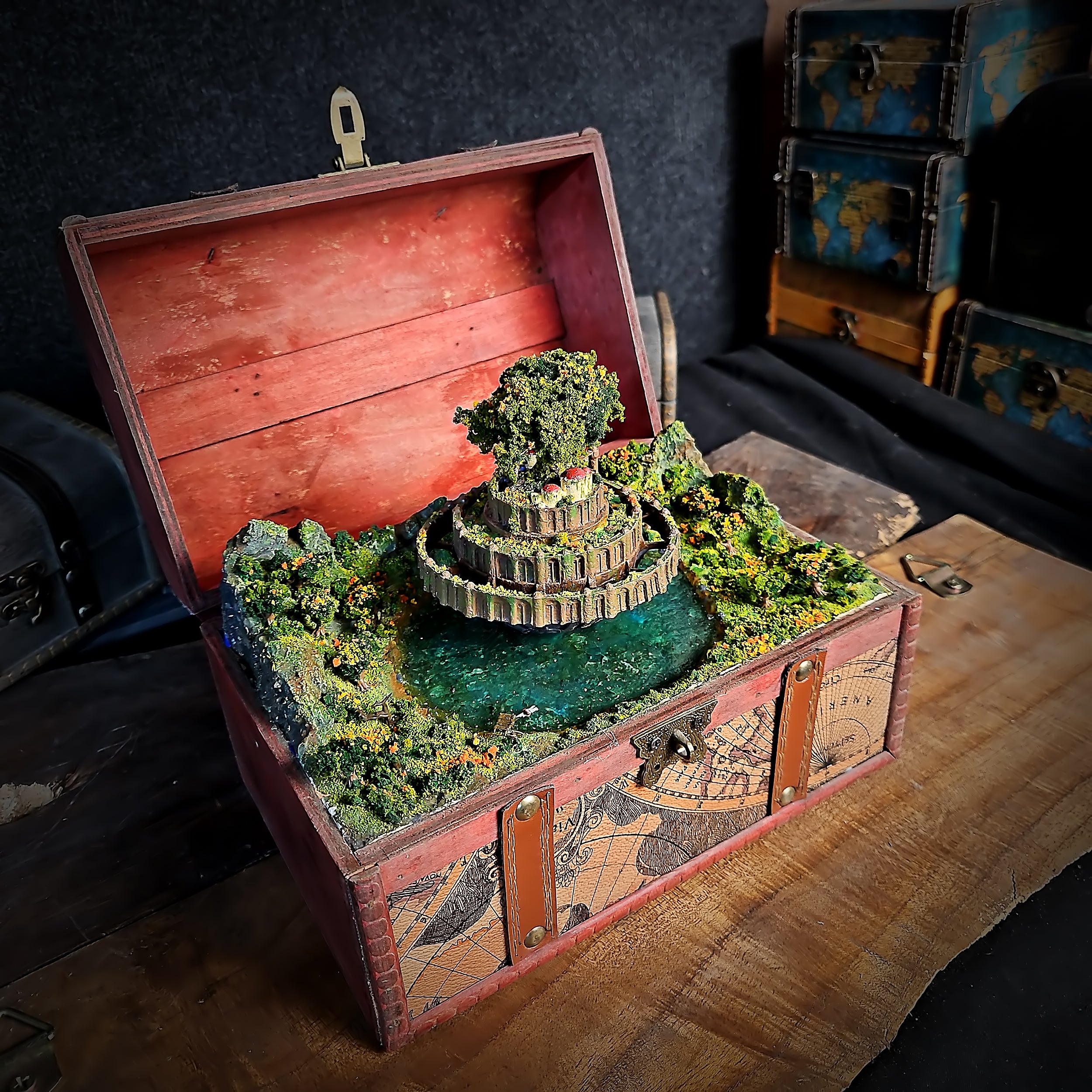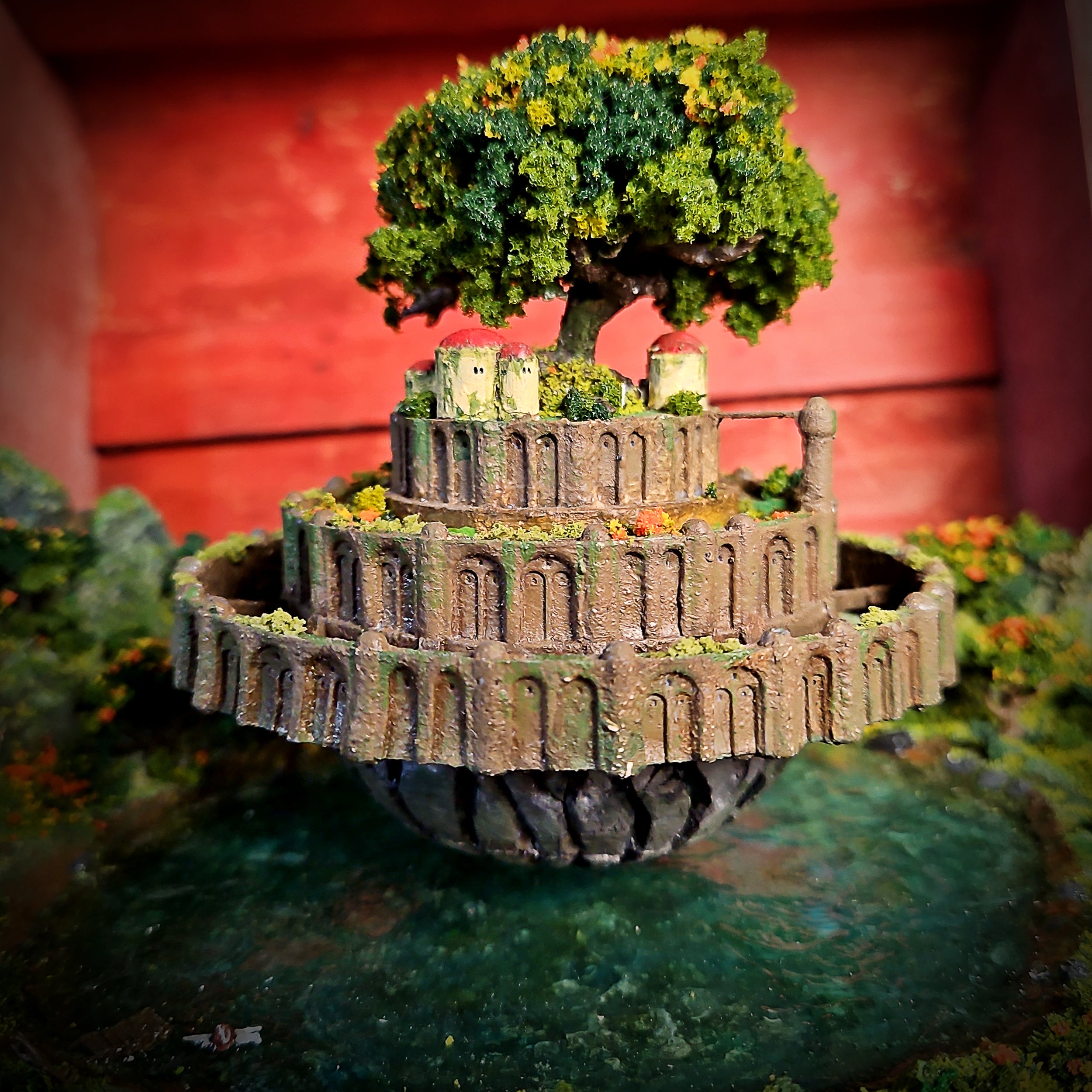 Miniature scene elements such as trees, figures, or buildings are handcrafted from resin using silicone molds or sculpted manually. These pieces are also painted and detailed to match the overall composition and bring the miniature world to life.