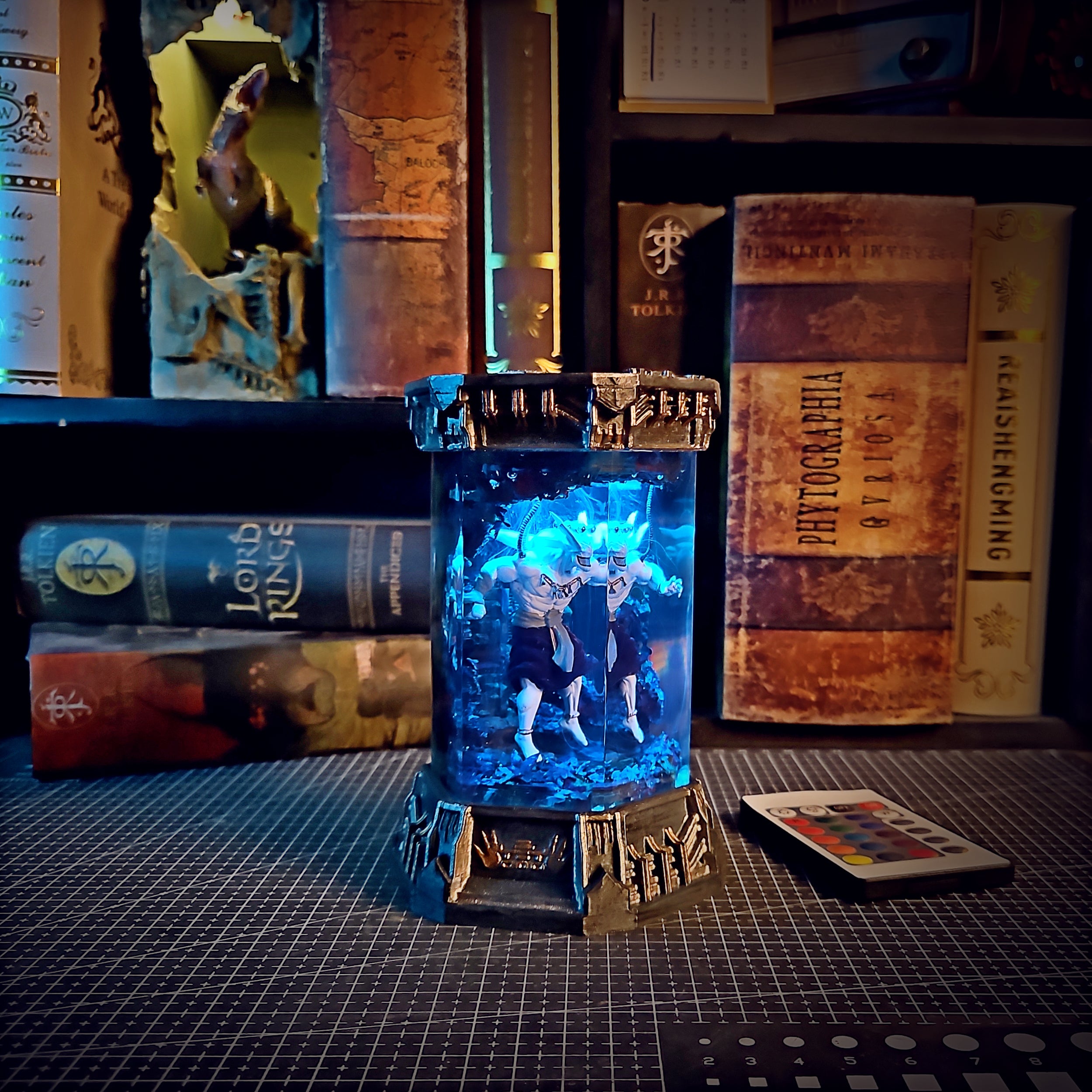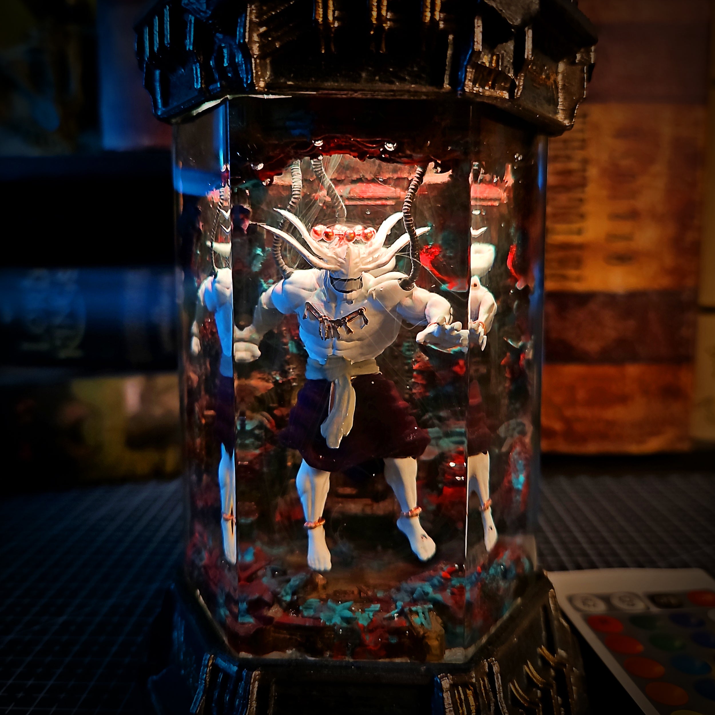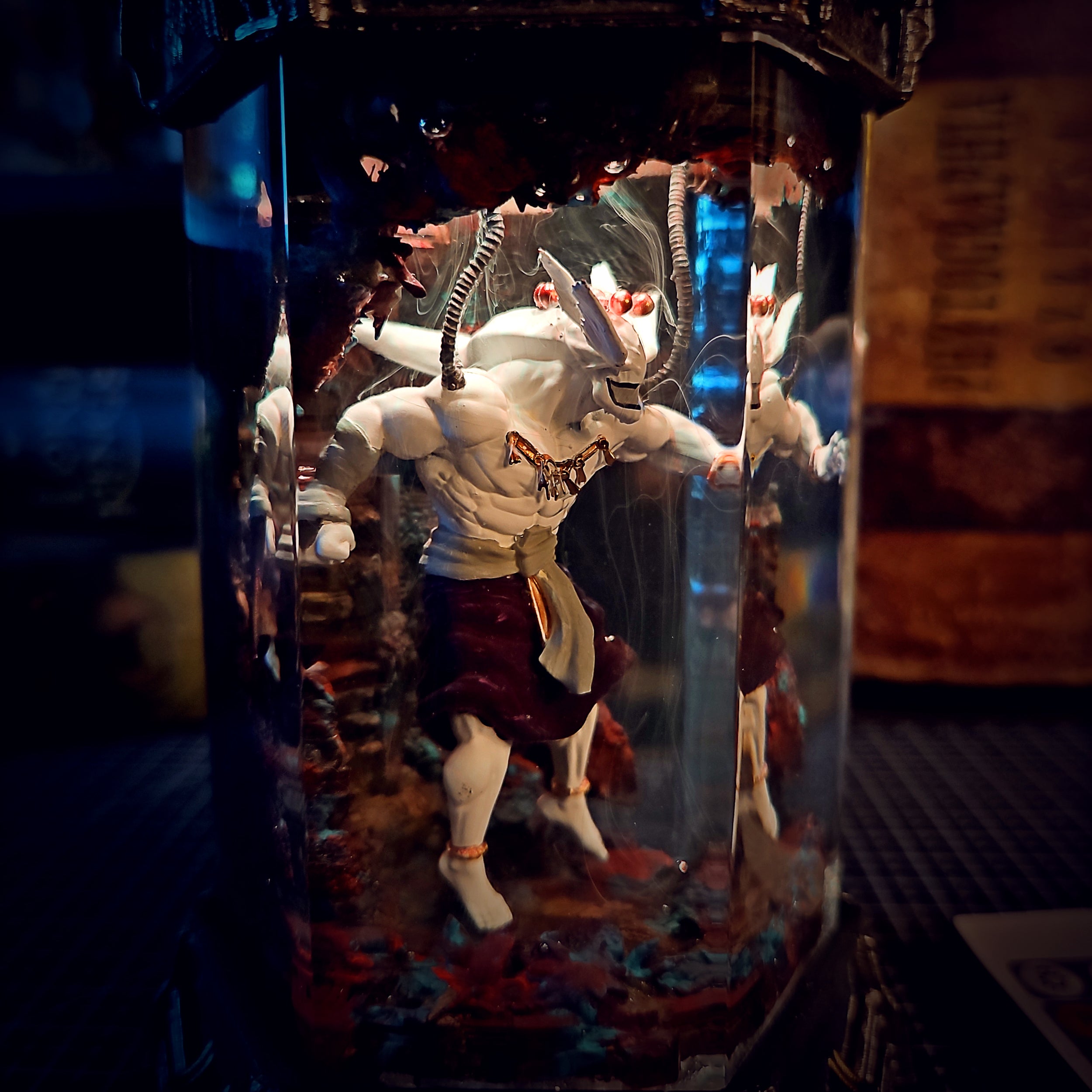 Inspired by ancient royal warriors, Maharaja stands tall inside a glowing biolab chamber. Gold accents and electric blue lighting bring out the mystic aura of this piece — a fusion of tradition and futuristic design.