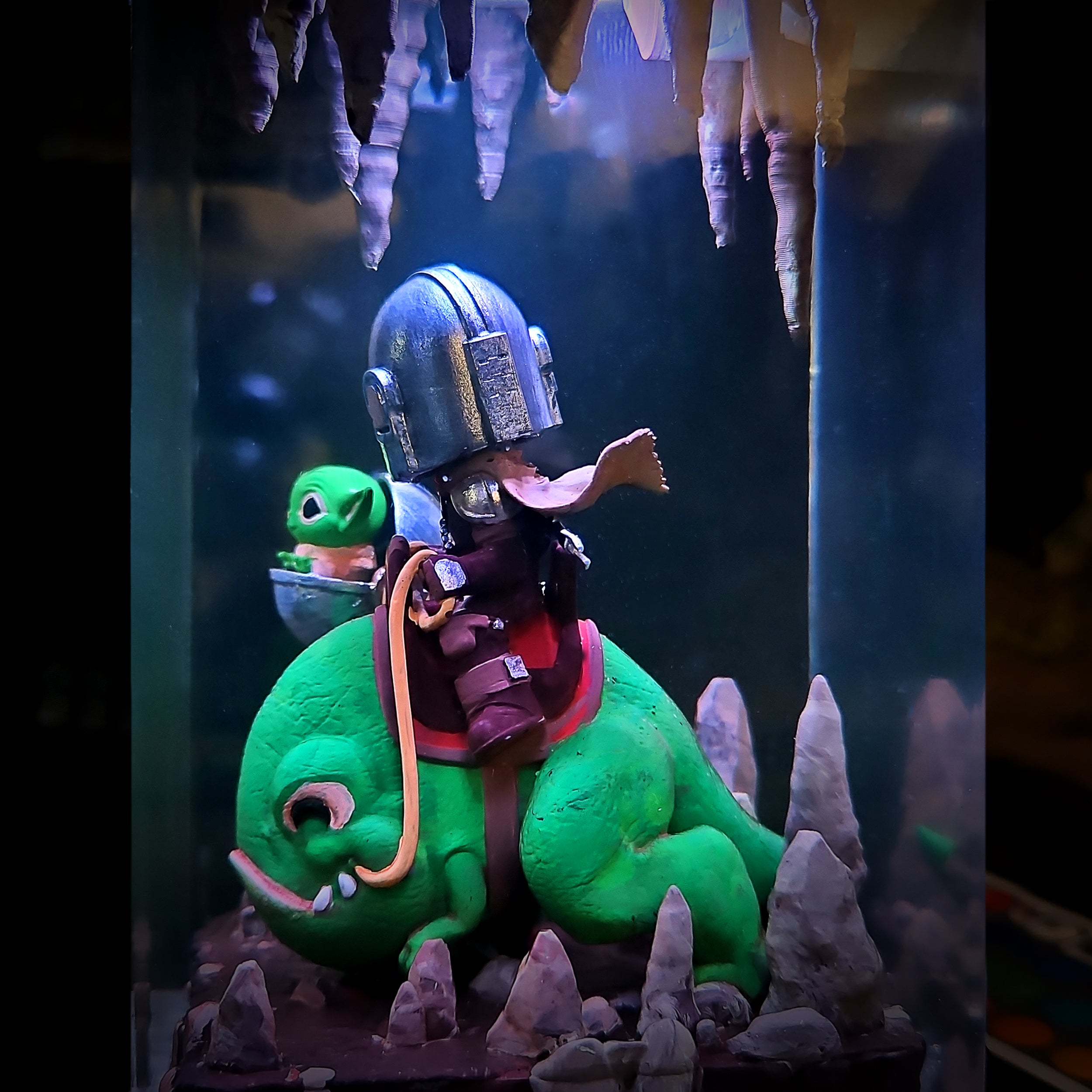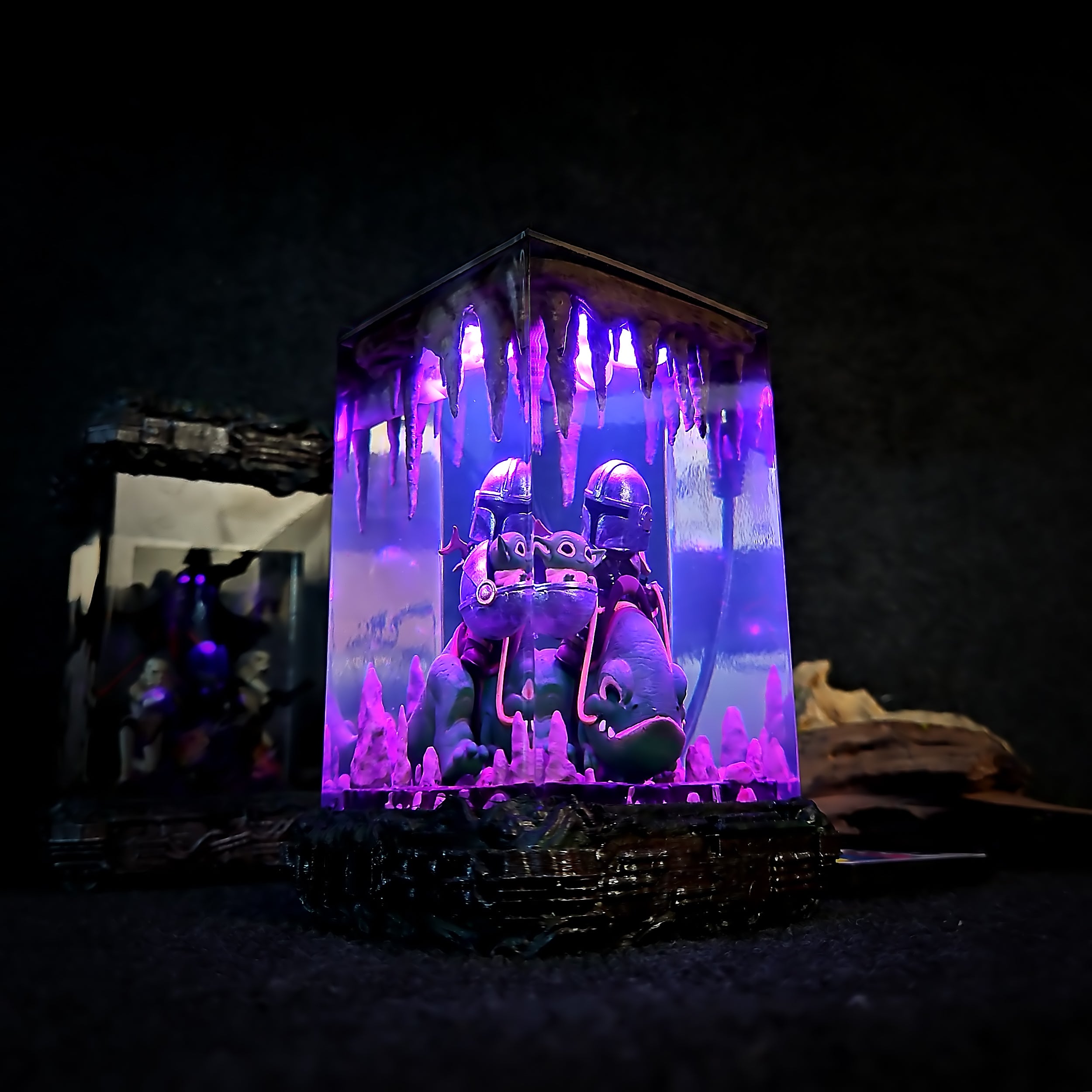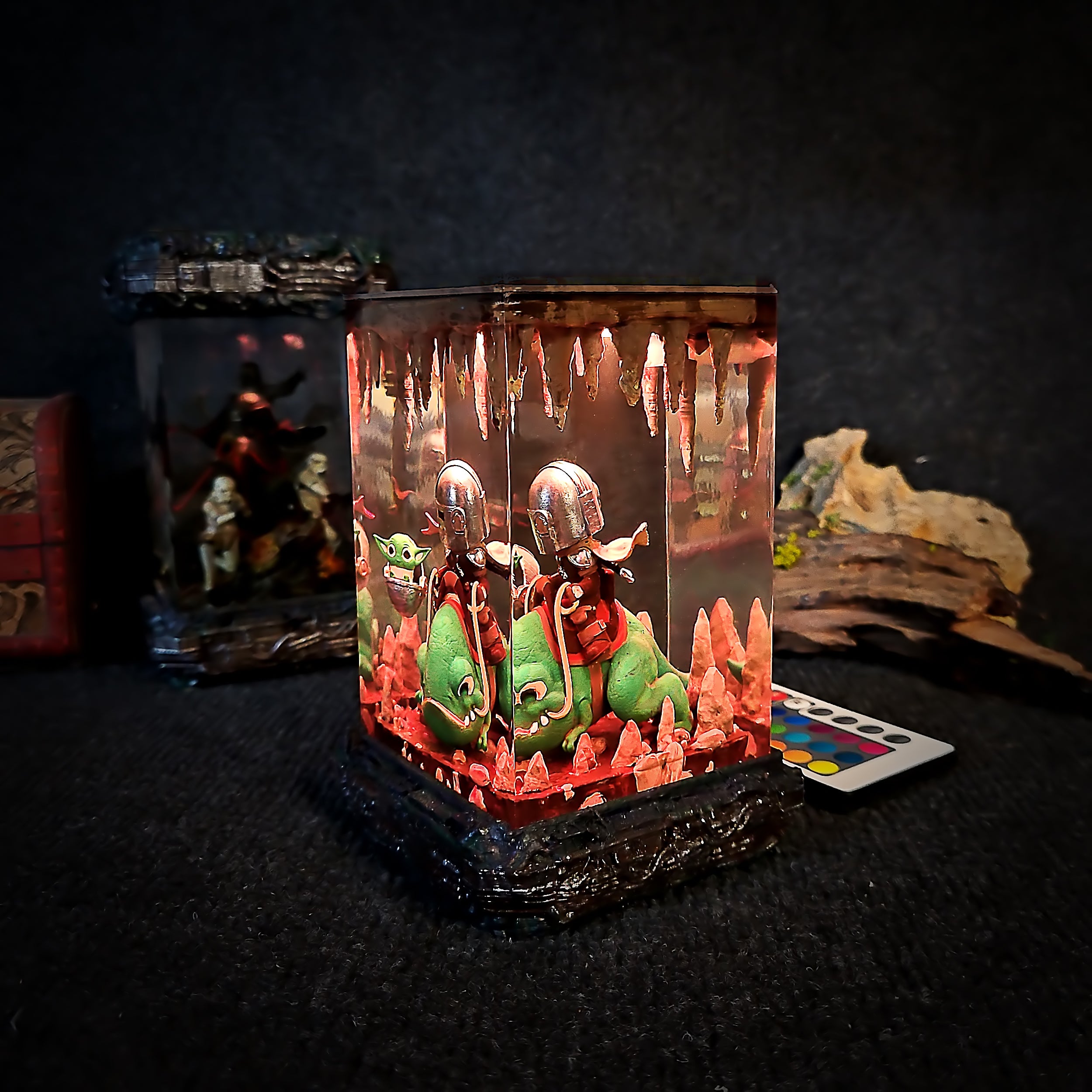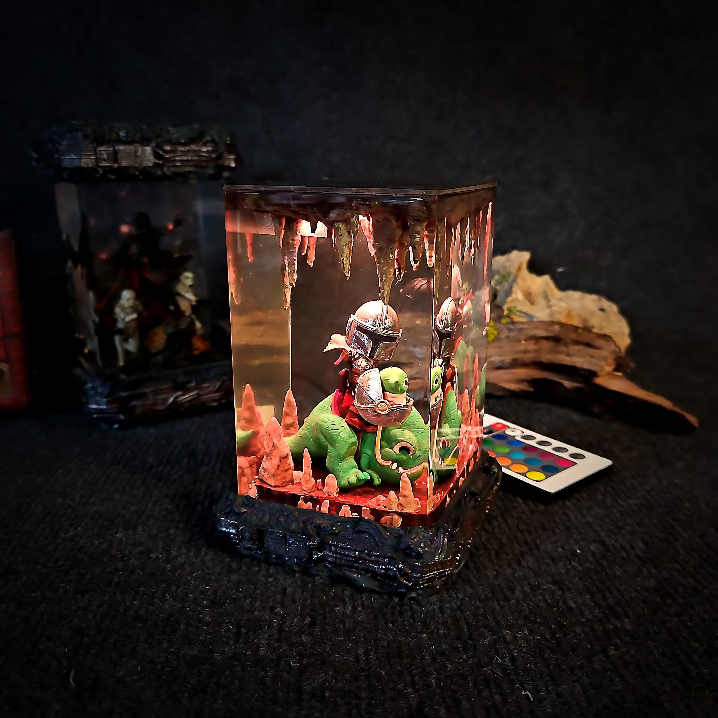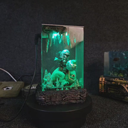 The Mandalorian Resin Lamp features the iconic bounty hunter in striking detail, suspended in a crystal-clear block of resin. With its glowing LED base, this lamp brings the stoic presence of Din Djarin to life, perfect for any fan of the Star Wars universe.