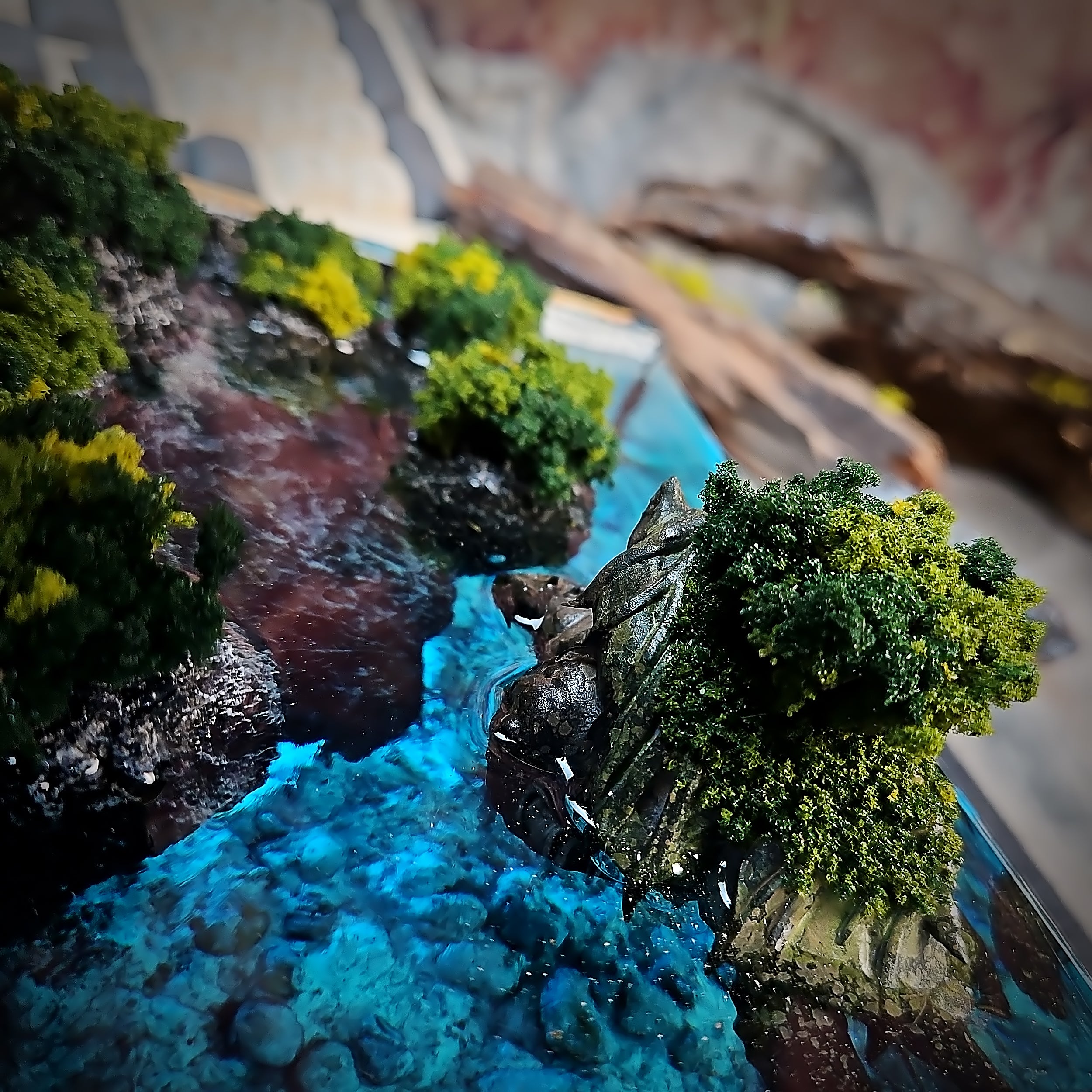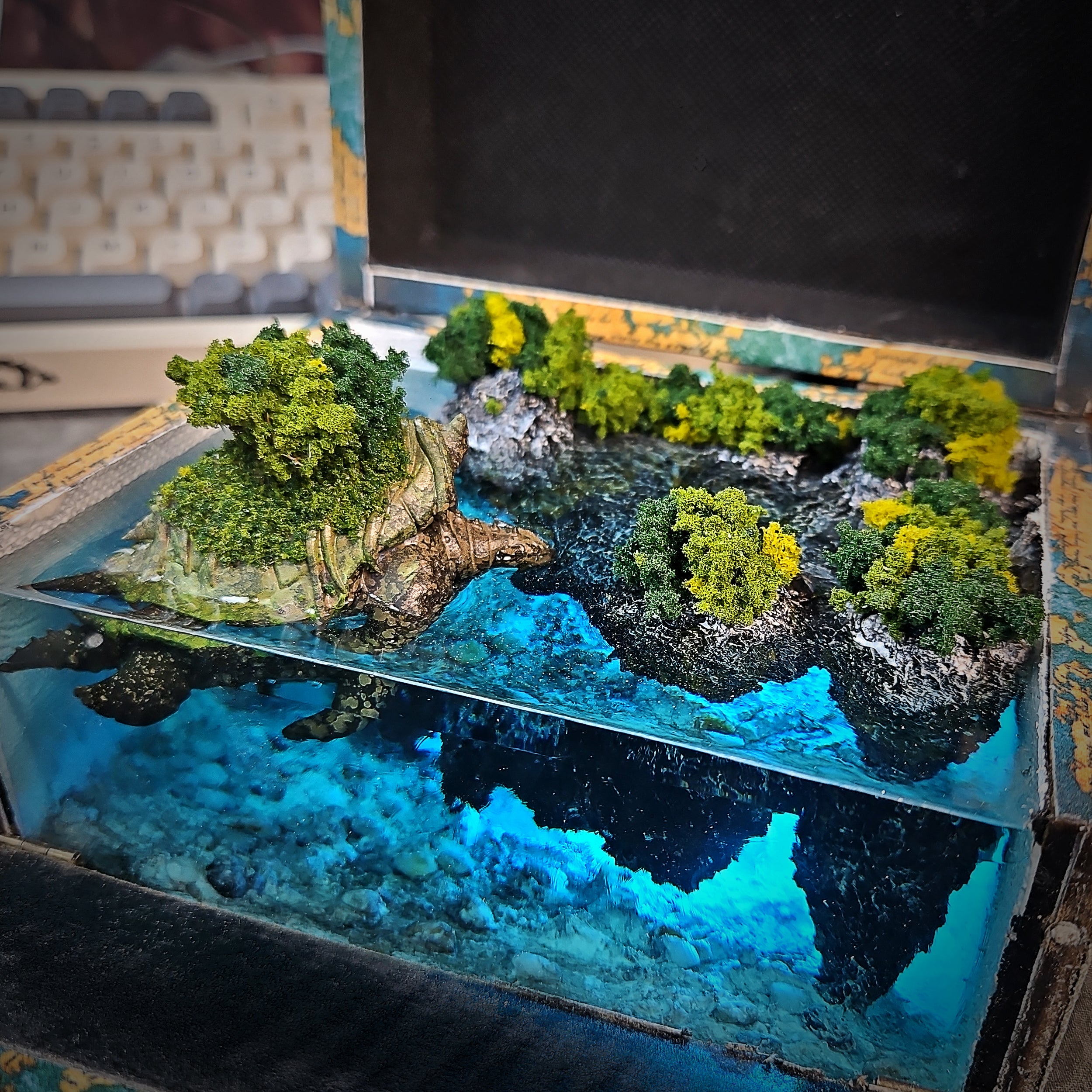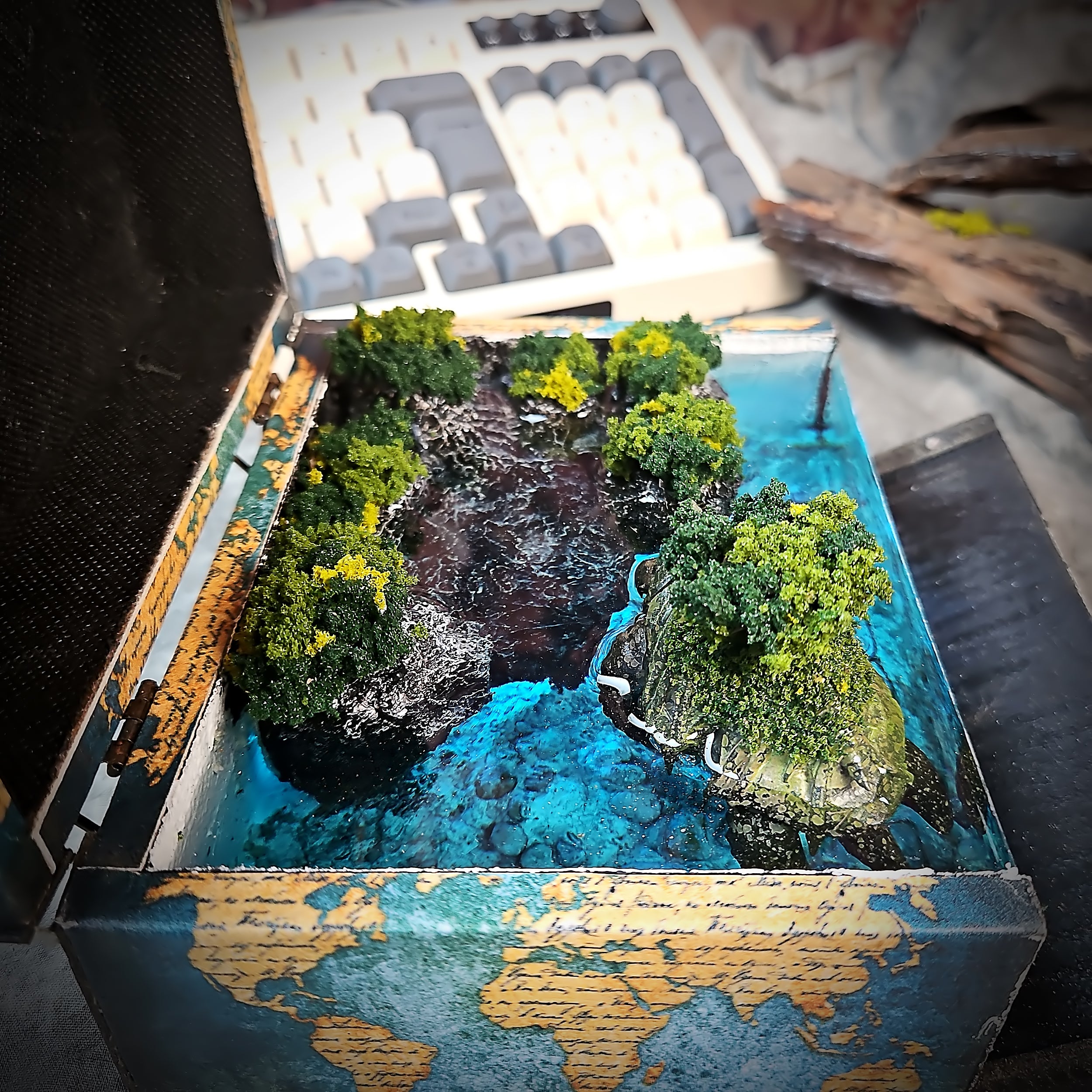 Miniature scene elements such as trees, figures, or buildings are handcrafted from resin using silicone molds or sculpted manually. These pieces are also painted and detailed to match the overall composition and bring the miniature world to life.