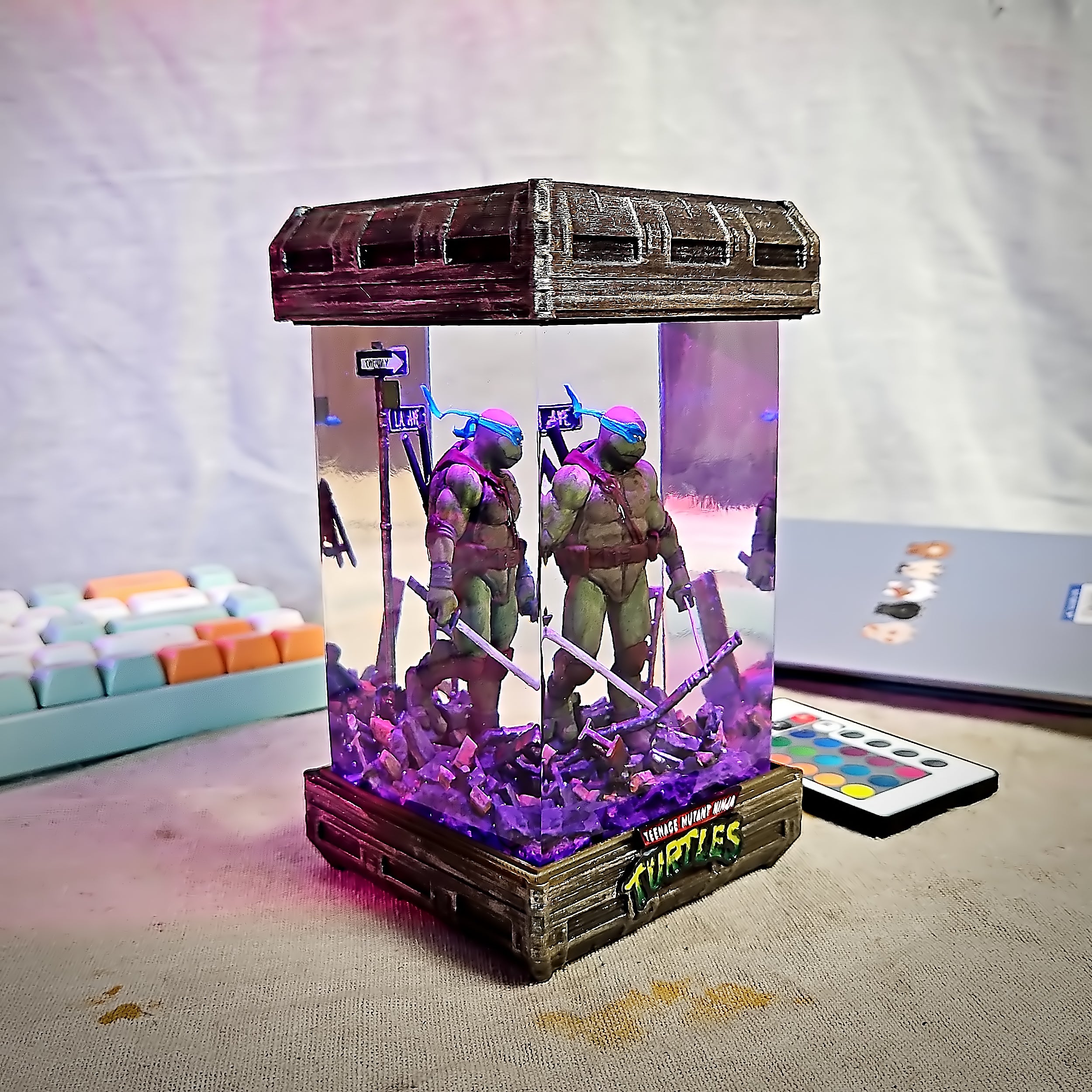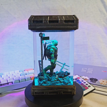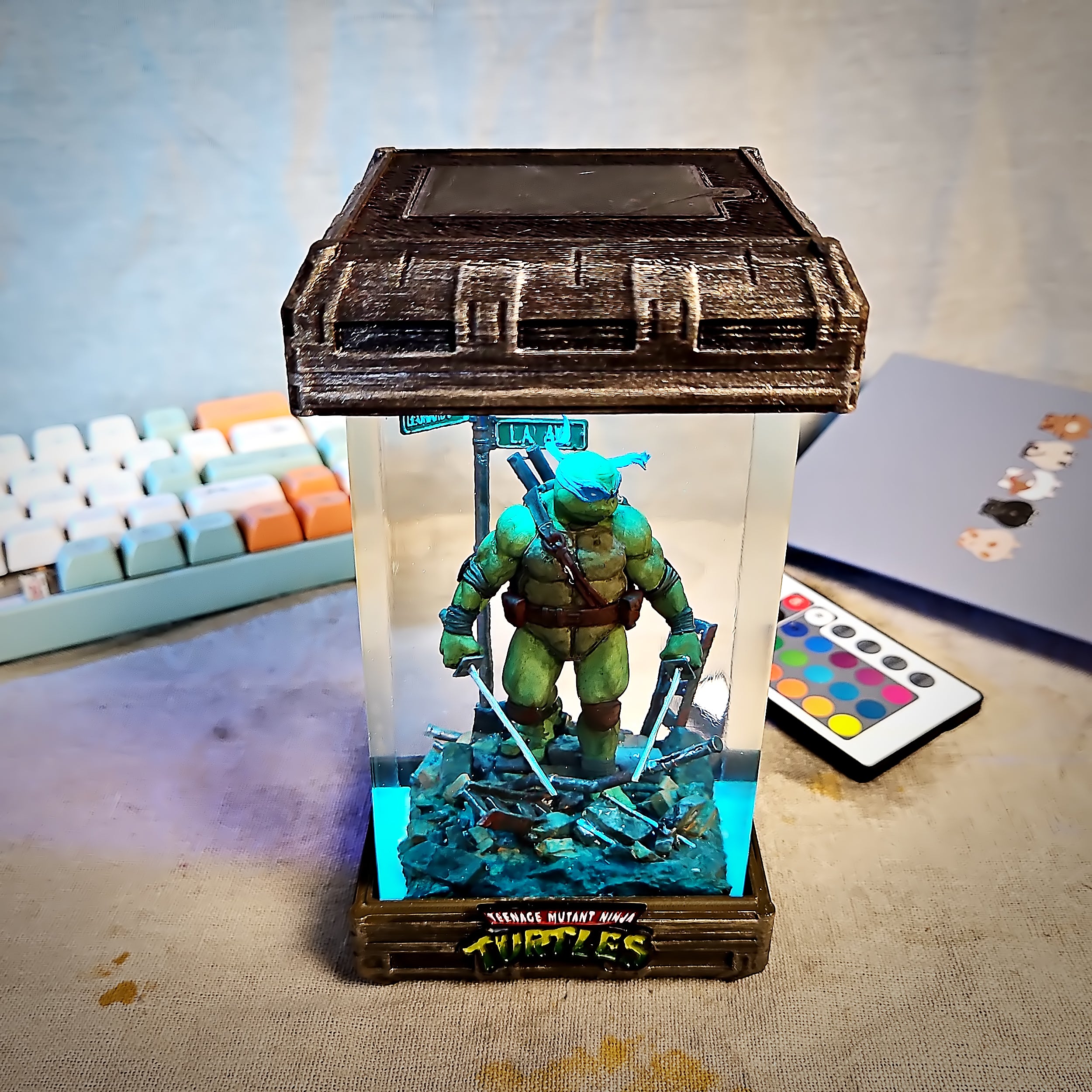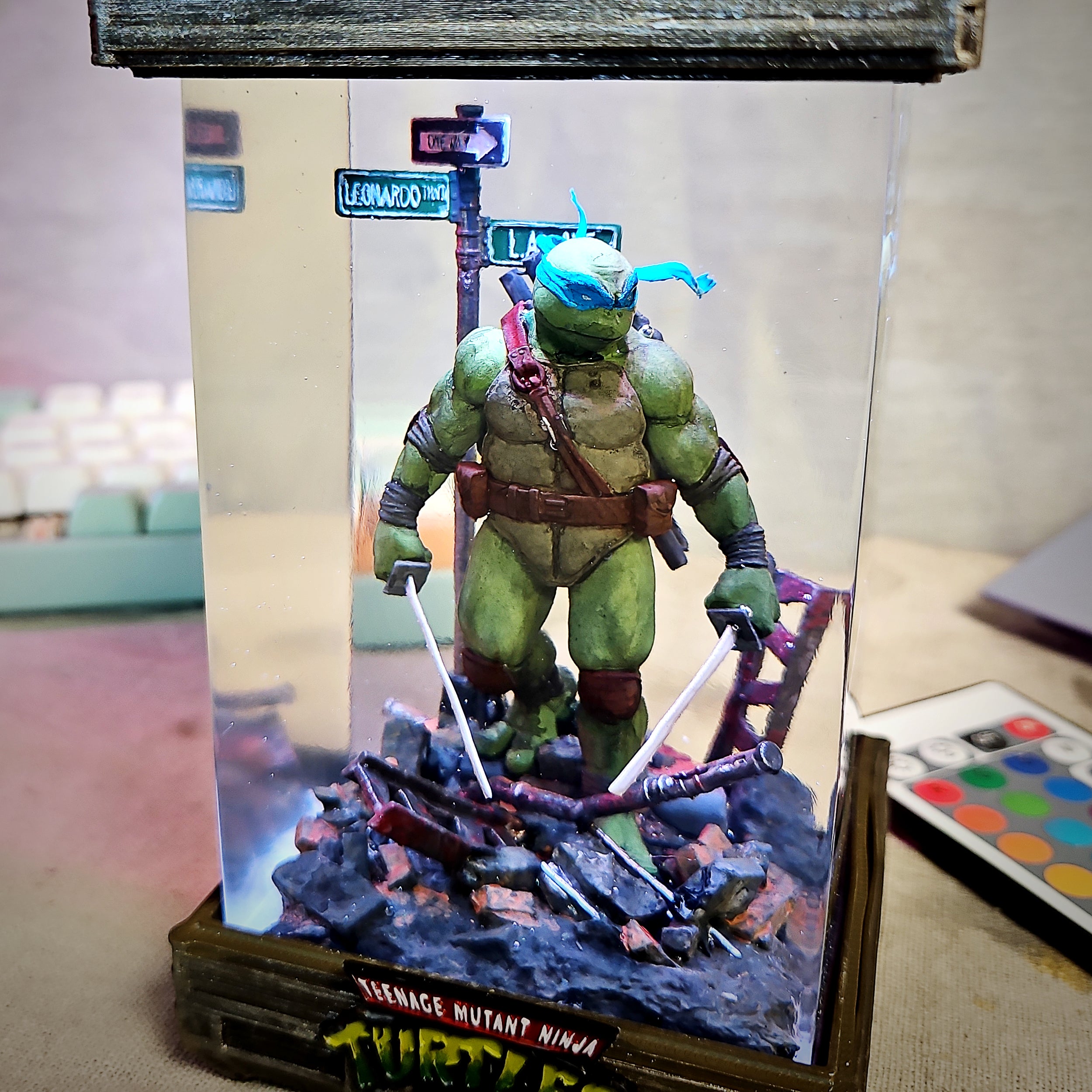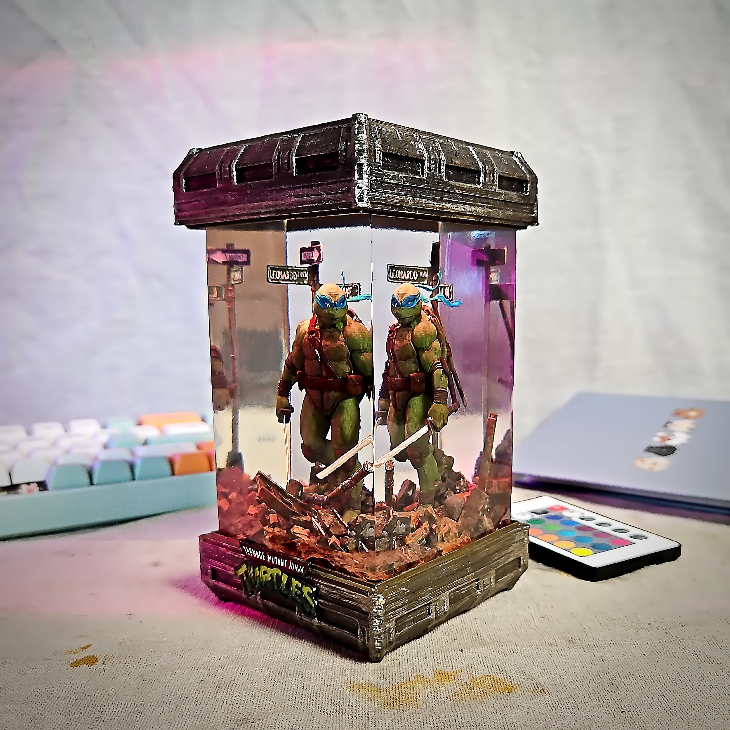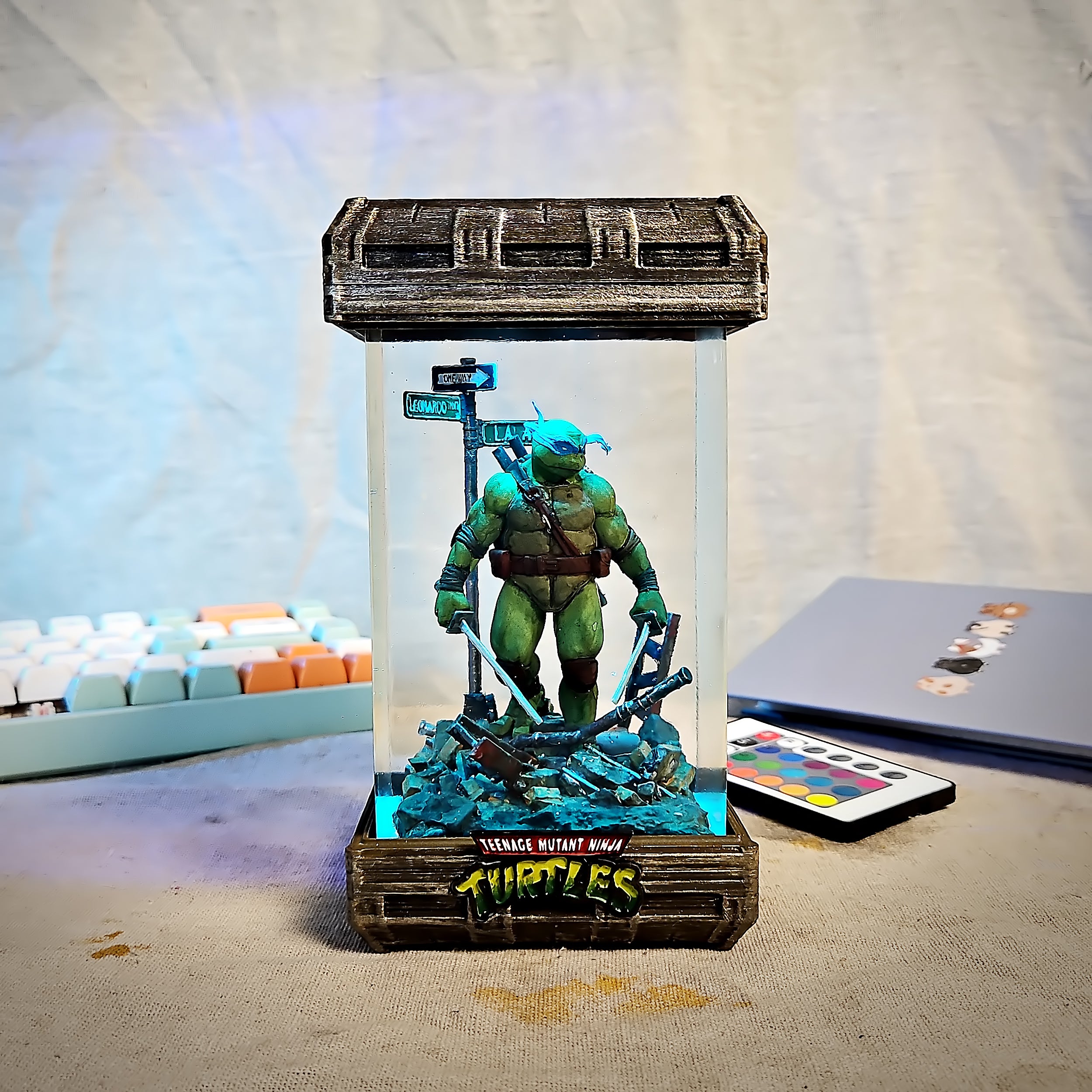 This resin lamp features the brave and strategic blue-masked ninja turtle, paying tribute to the fearless leader of the team. With his iconic katana blades and calm focus, the character is posed heroically in a glowing resin scene. The background lighting enhances the metallic and reptilian textures, making it a standout collectible for fans of the Teenage Mutant Ninja Turtles franchise.