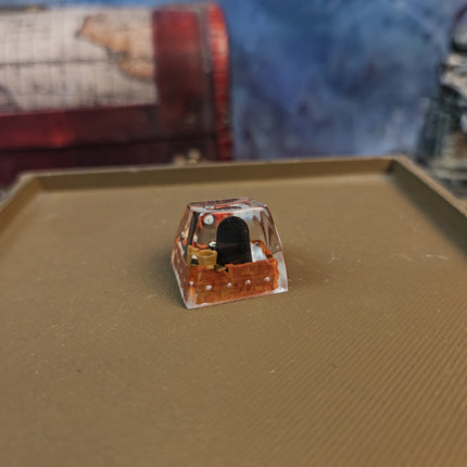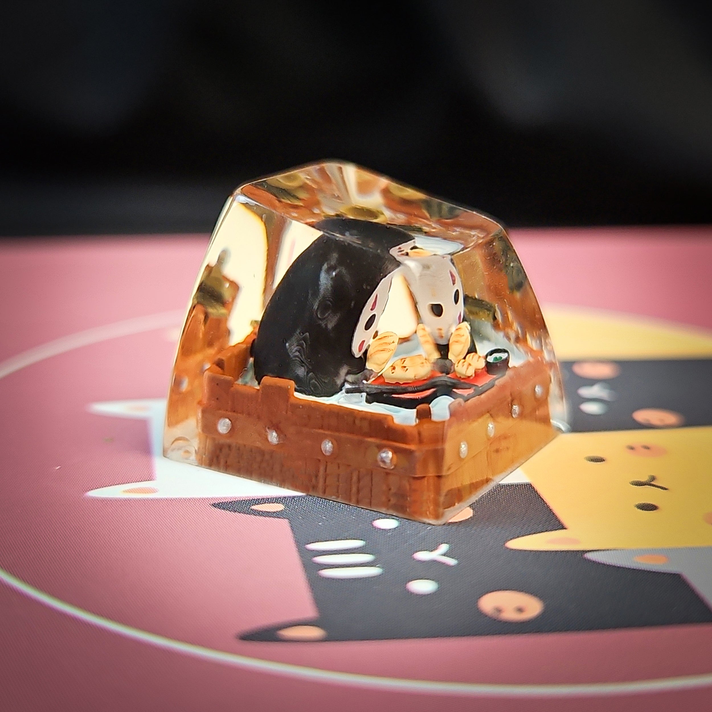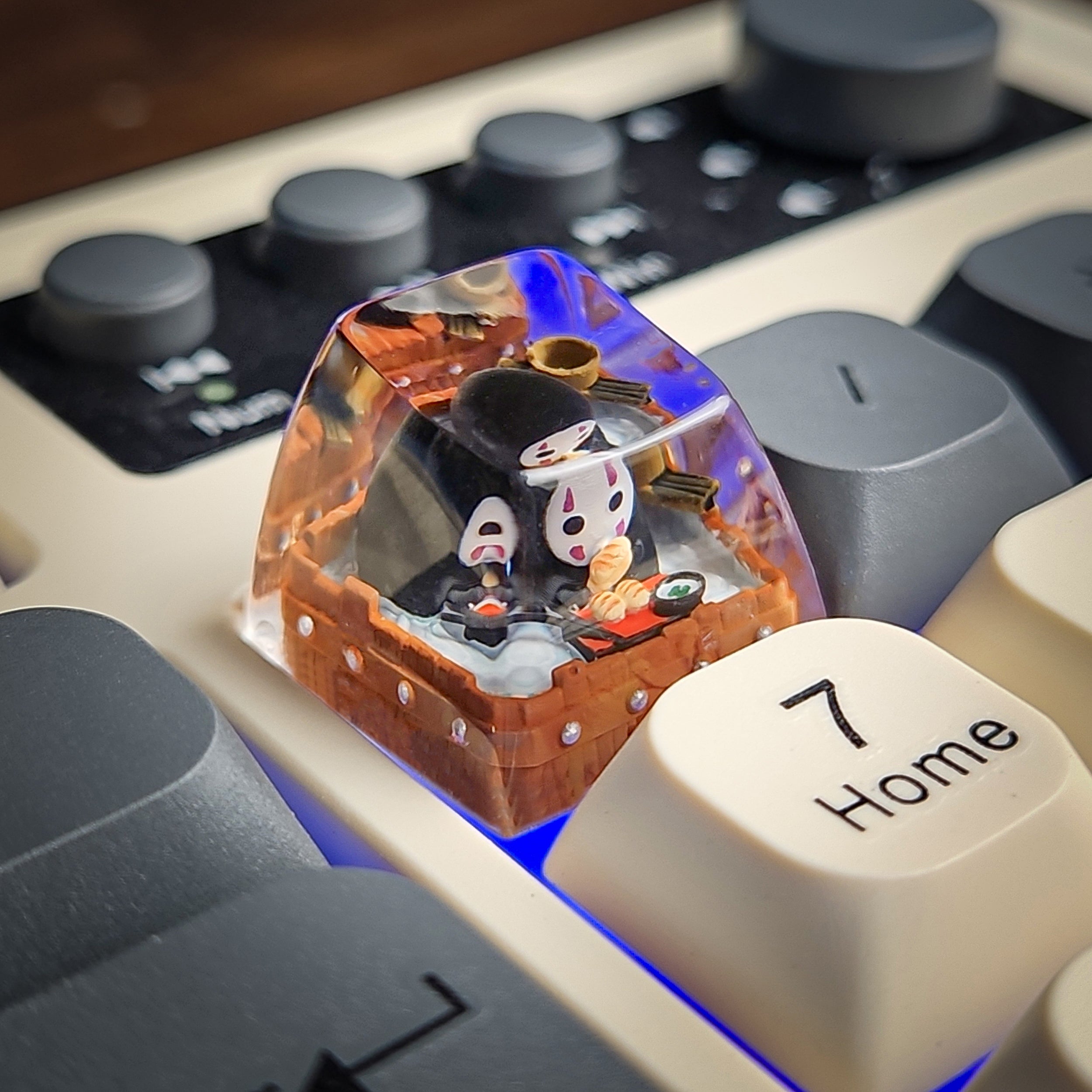 Set against a softly glowing background, the keycap evokes the dreamy, magical atmosphere of the film. The use of translucent resin layering creates depth, as if No Face is floating quietly in a mystical bathhouse world. Subtle sparkles and warm lighting effects are embedded beneath the surface, adding to the ethereal quality of the design.