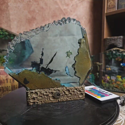 The Ocean Shipwreck Resin Lamp tells a mysterious underwater story. A sunken ship lies beneath the waves, scattered with relics and marine life, bathed in a soft glow. It’s a captivating conversation piece that evokes both beauty and mystery.