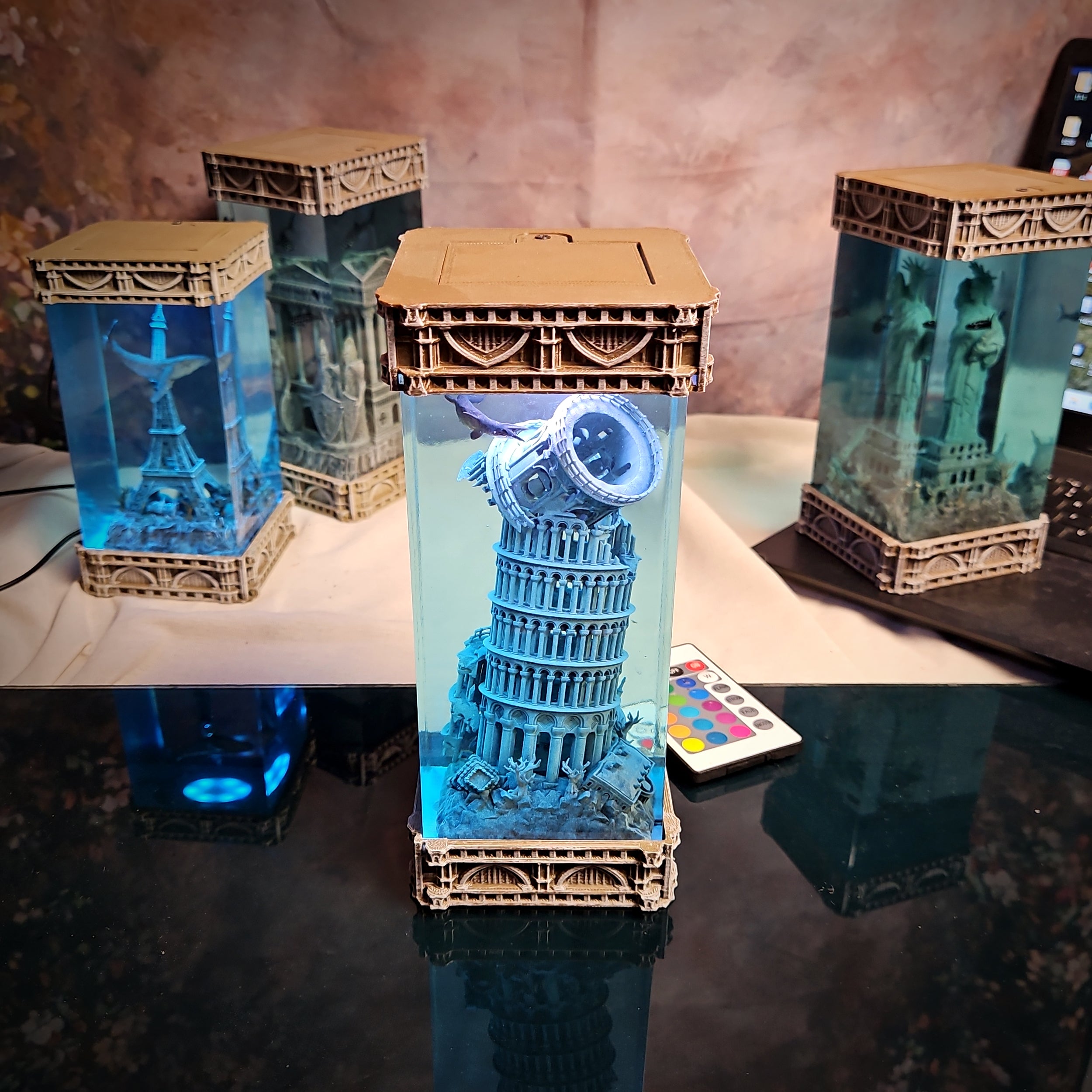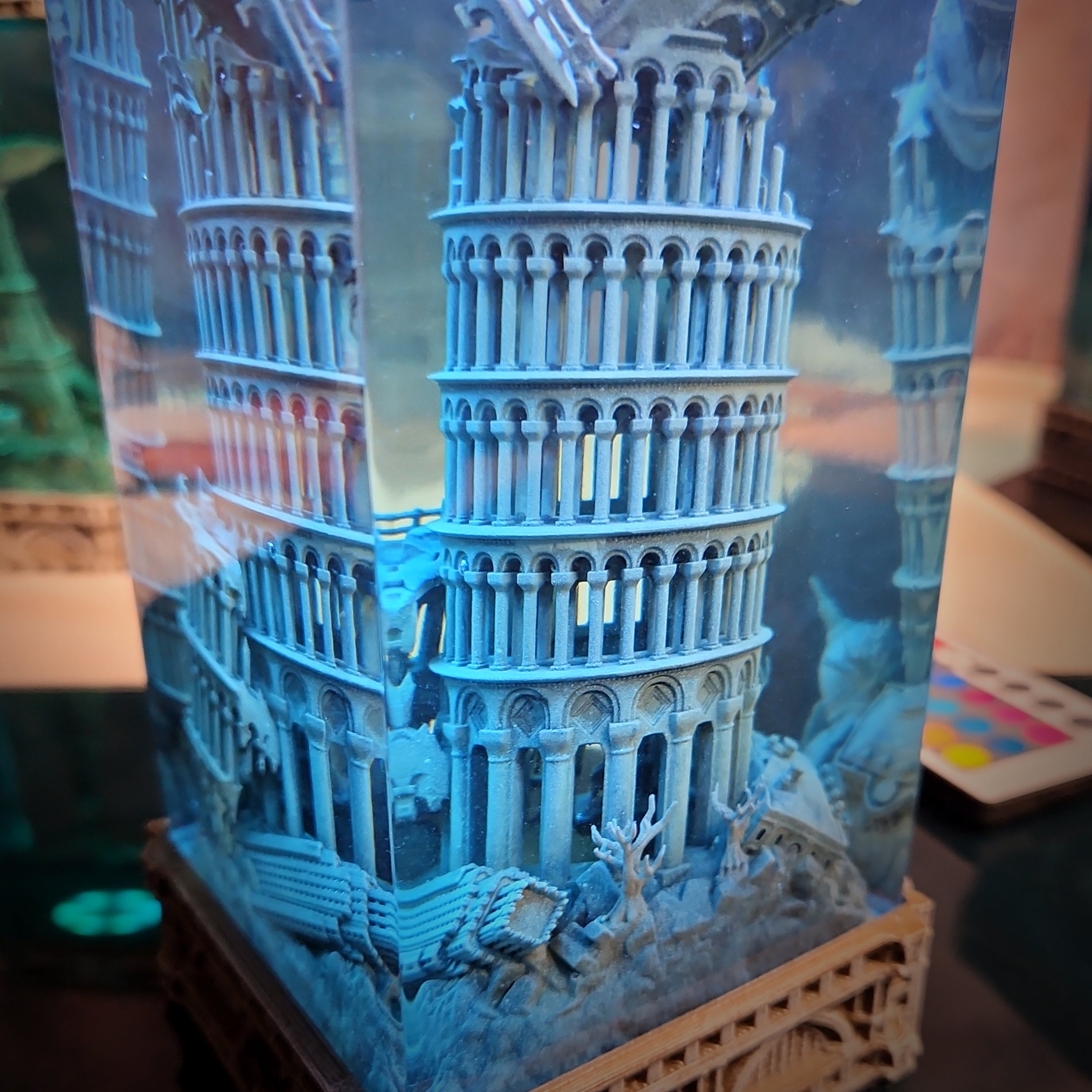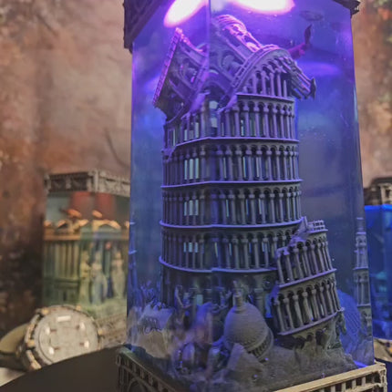 This version of the Gothic Pisa Lamp captures the iconic leaning tower with detailed gothic textures and a moody atmosphere, untouched by time. Without the clock face, it serves purely as a sculpture—lit from within to bring out shadows and highlights that mimic the aging of stone and history.