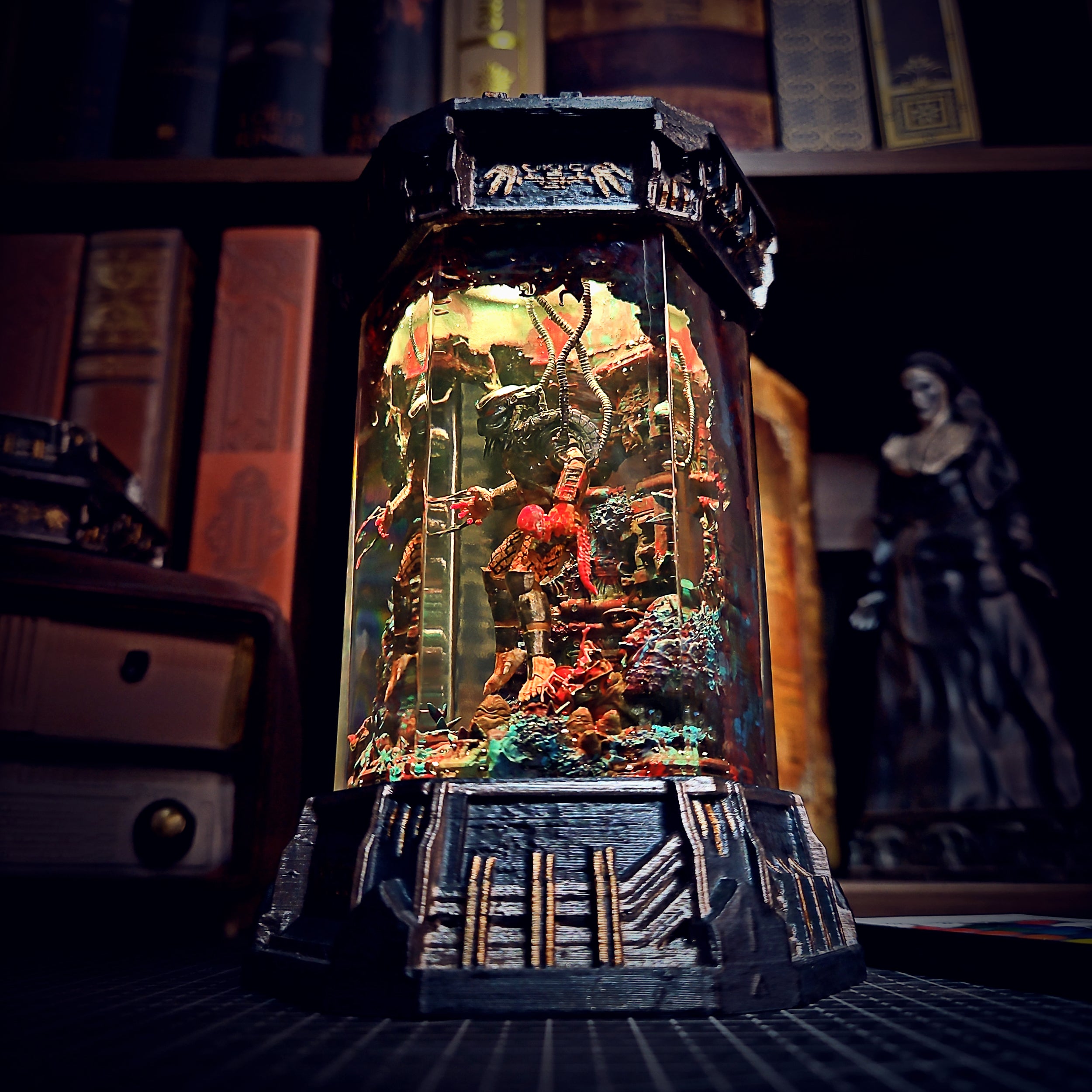 Predator stands frozen in mid-hunt inside the illuminated Biolab capsule. The combination of green and red LED lights enhances his fearsome armor and otherworldly presence — a tribute to the ultimate intergalactic hunter.