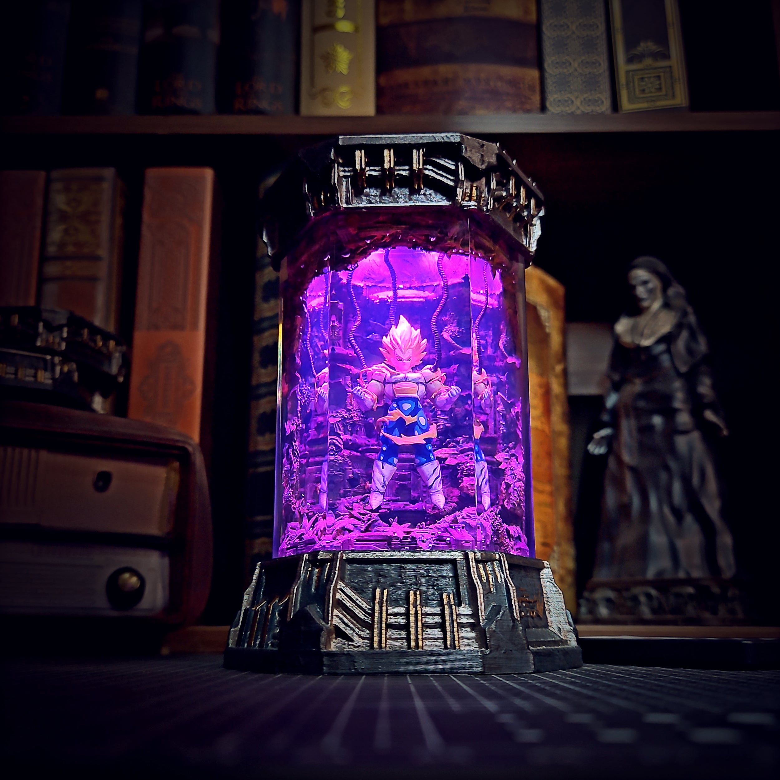 Prince Vegeta channels his immense power, surrounded by glowing blue energy inside the Biolab Hex. A striking piece for anime...