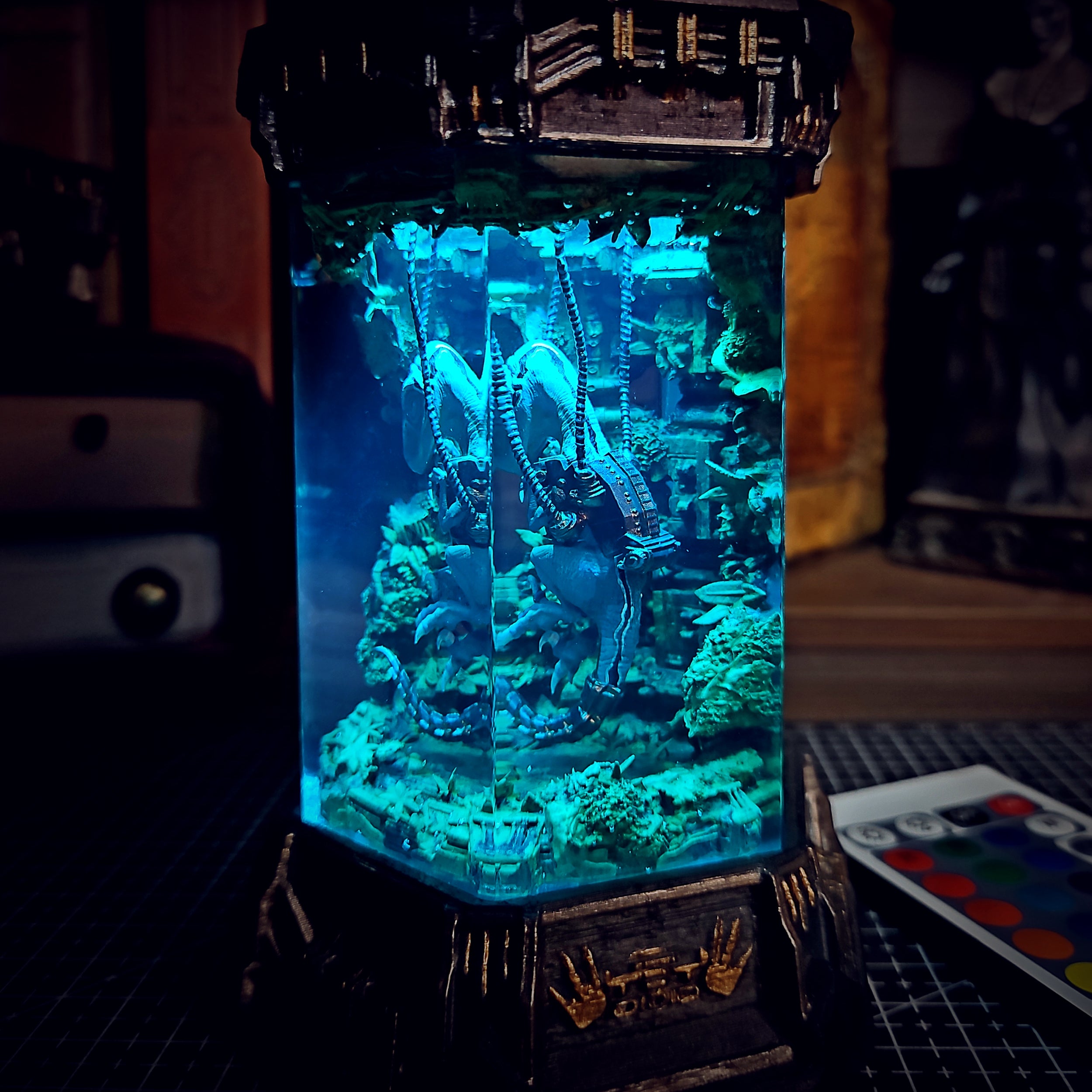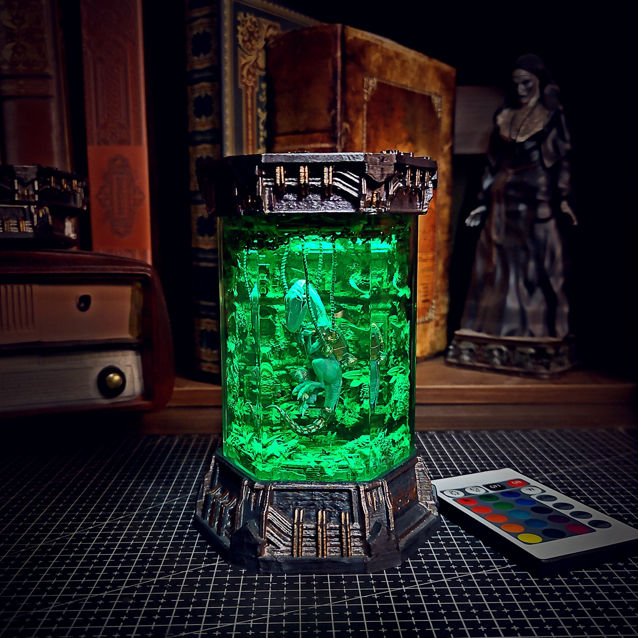 Fast, fierce, and intelligent — the Raptor prowls inside its containment chamber, glowing with violet energy. The detailed pose and handcrafted finish make this model a striking addition to any sci-fi or Jurassic display collection.
