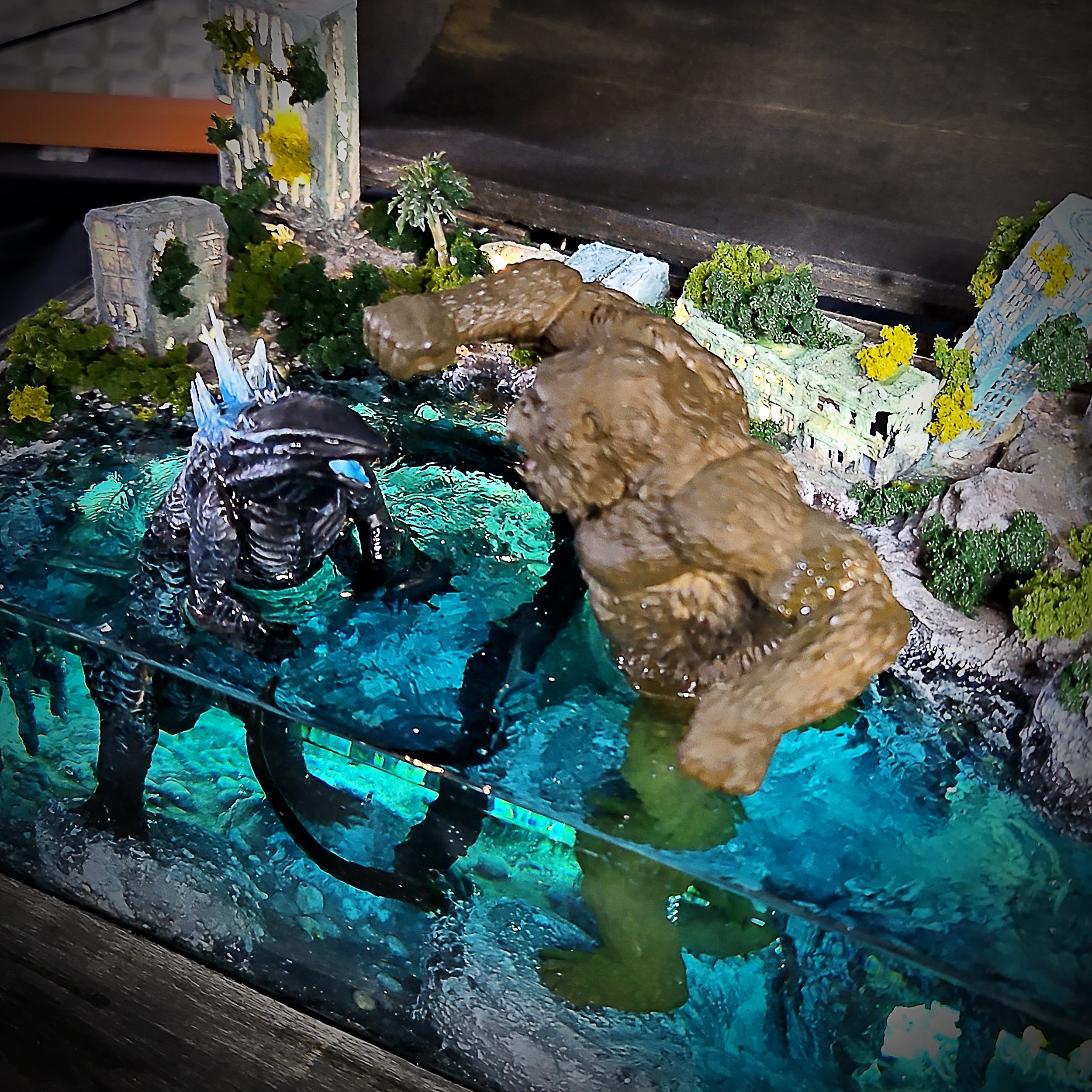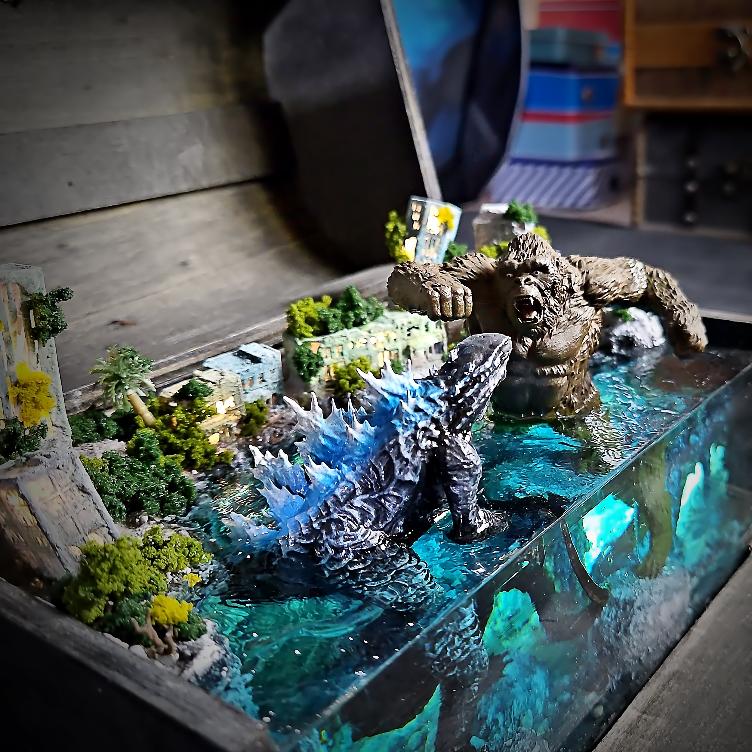 Witness the Clash of Titans: Handcrafted Resin Diorama Lamp Showcasing Godzilla vs. Kong