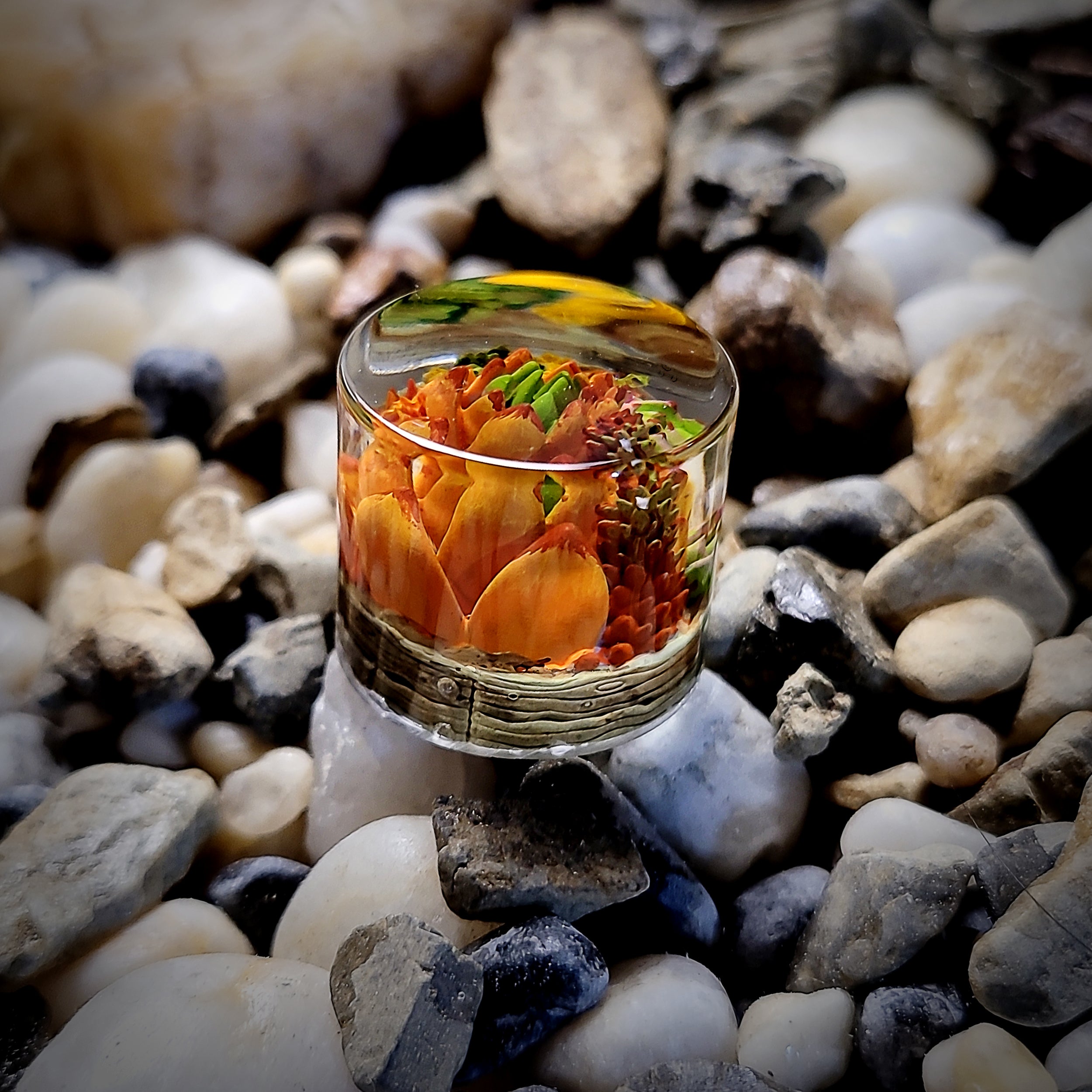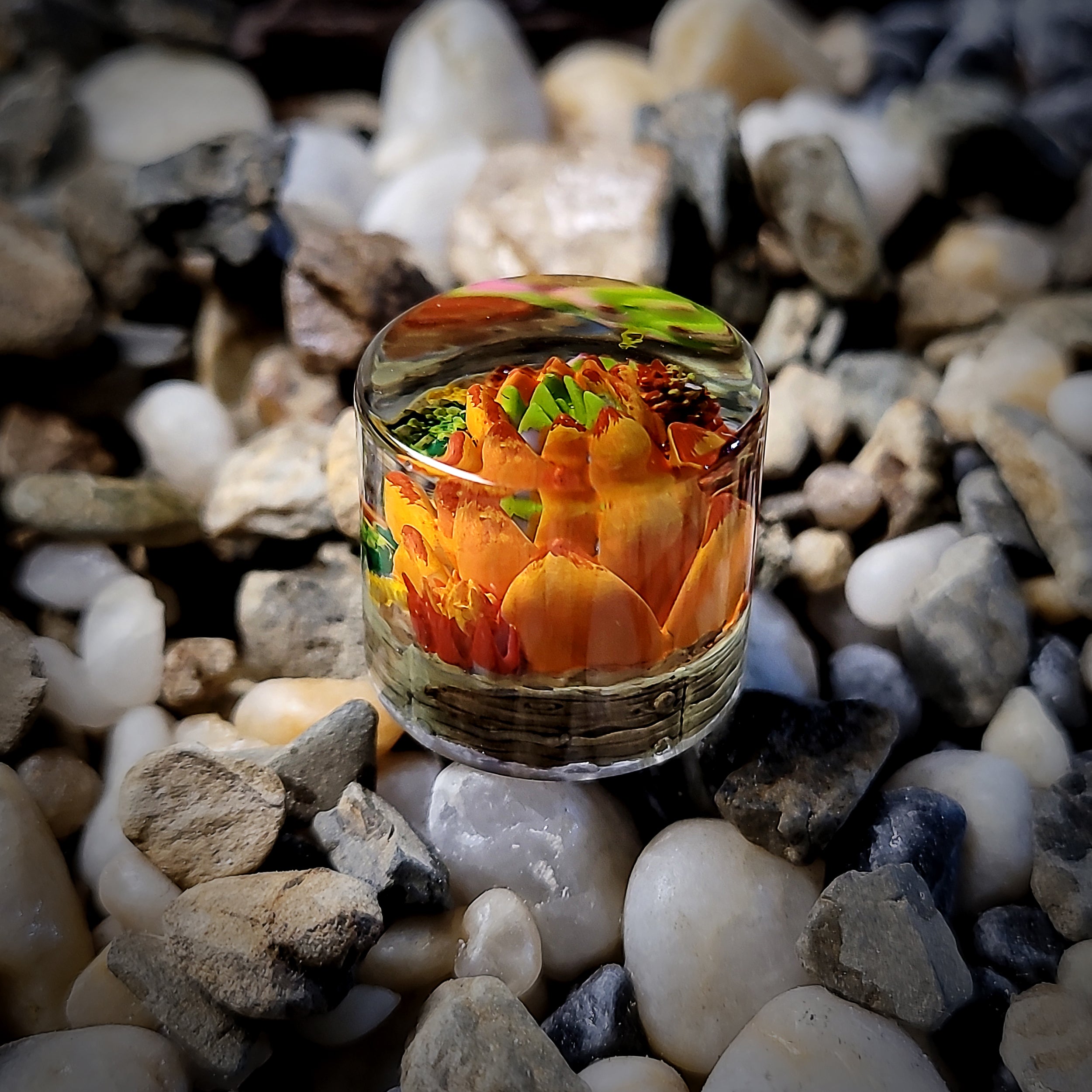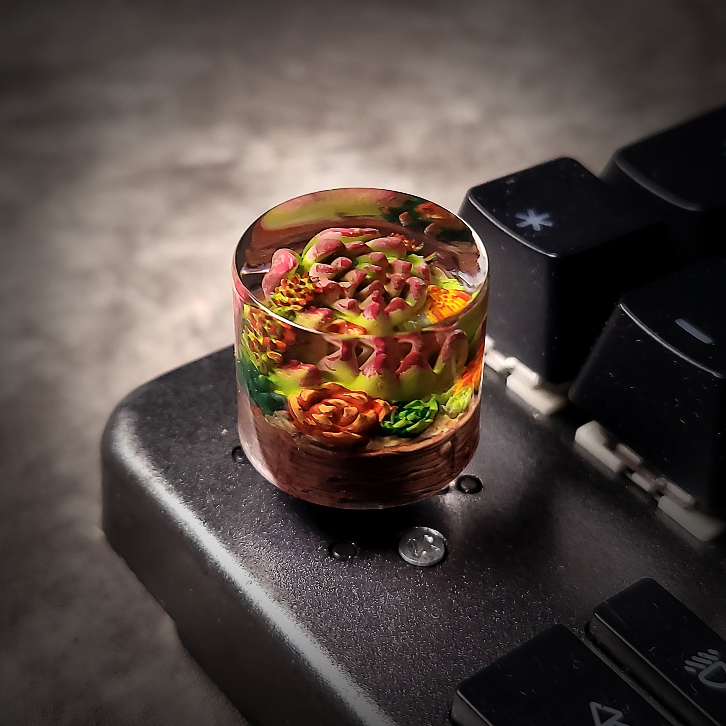 Encased in a smooth, clear resin dome, the succulent design appears to blossom from within—its sculpted petals radiating outwards with lifelike texture and gentle curves. The interplay of red and purple pigments gives depth and warmth, while subtle highlights catch the light beautifully with every turn of the knob. Whether used for volume control or custom macros, it adds both elegance and functionality.