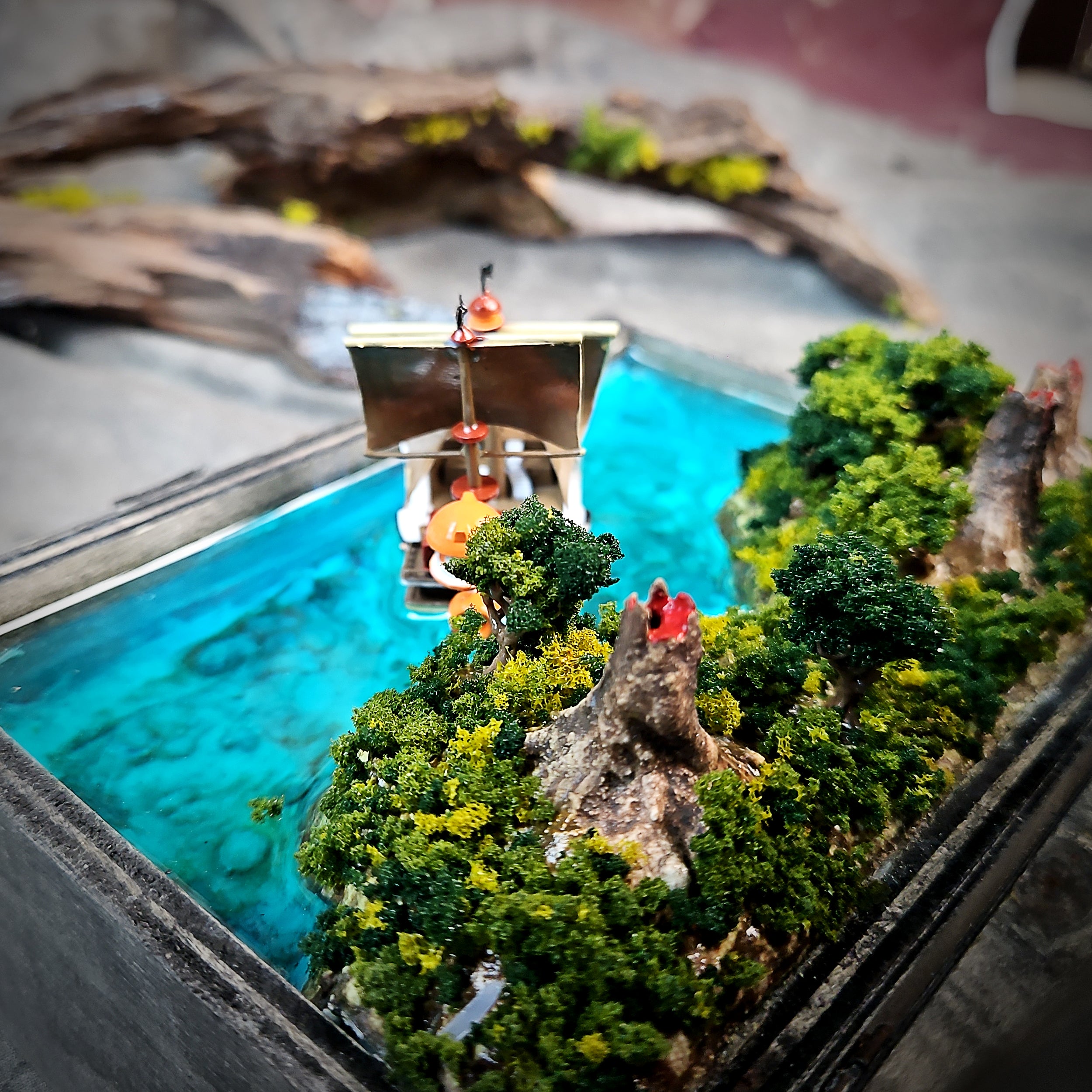 Miniature scene elements such as trees, figures, or buildings are handcrafted from resin using silicone molds or sculpted manually. These pieces are also painted and detailed to match the overall composition and bring the miniature world to life.