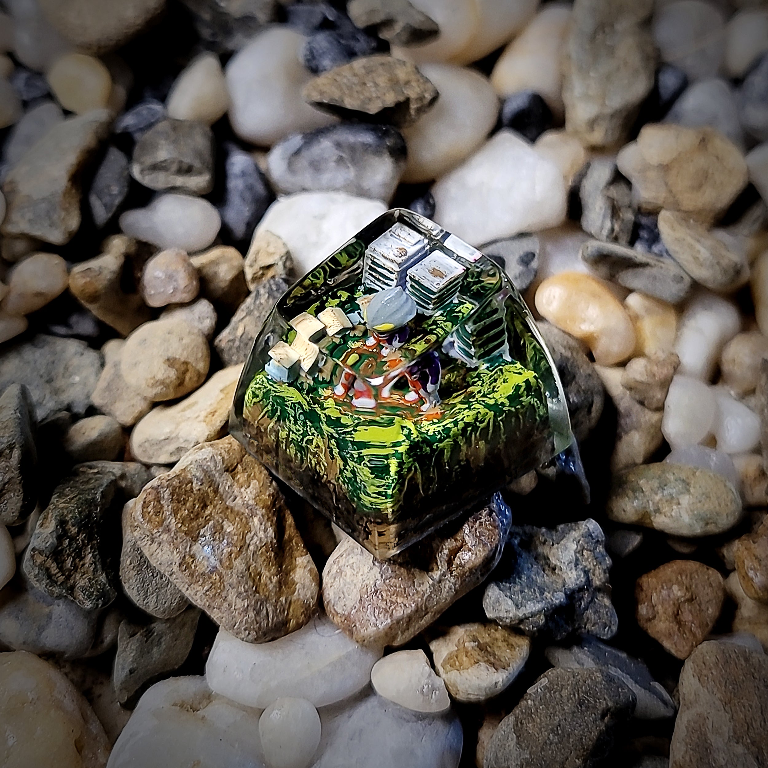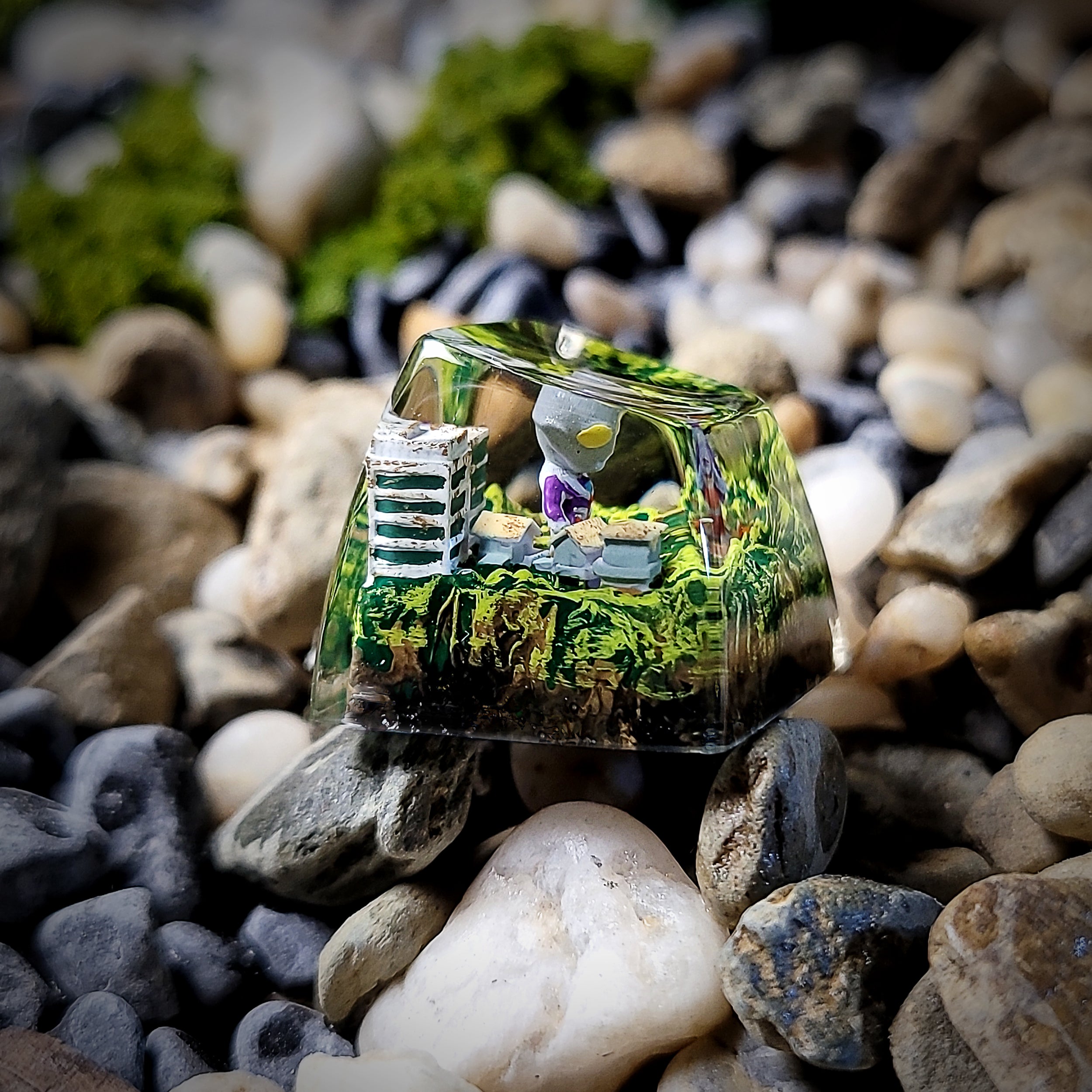 This handcrafted 1u resin keycap captures the heroic essence of Ultraman, the legendary defender from Japanese tokusatsu lore. Encased beneath a crystal-clear resin dome, Ultraman’s iconic silver and red helmet is sculpted with precision, featuring his glowing yellow eyes and signature crest. Each detail is carefully painted by hand, preserving the character’s bold, futuristic design in striking miniature form.
