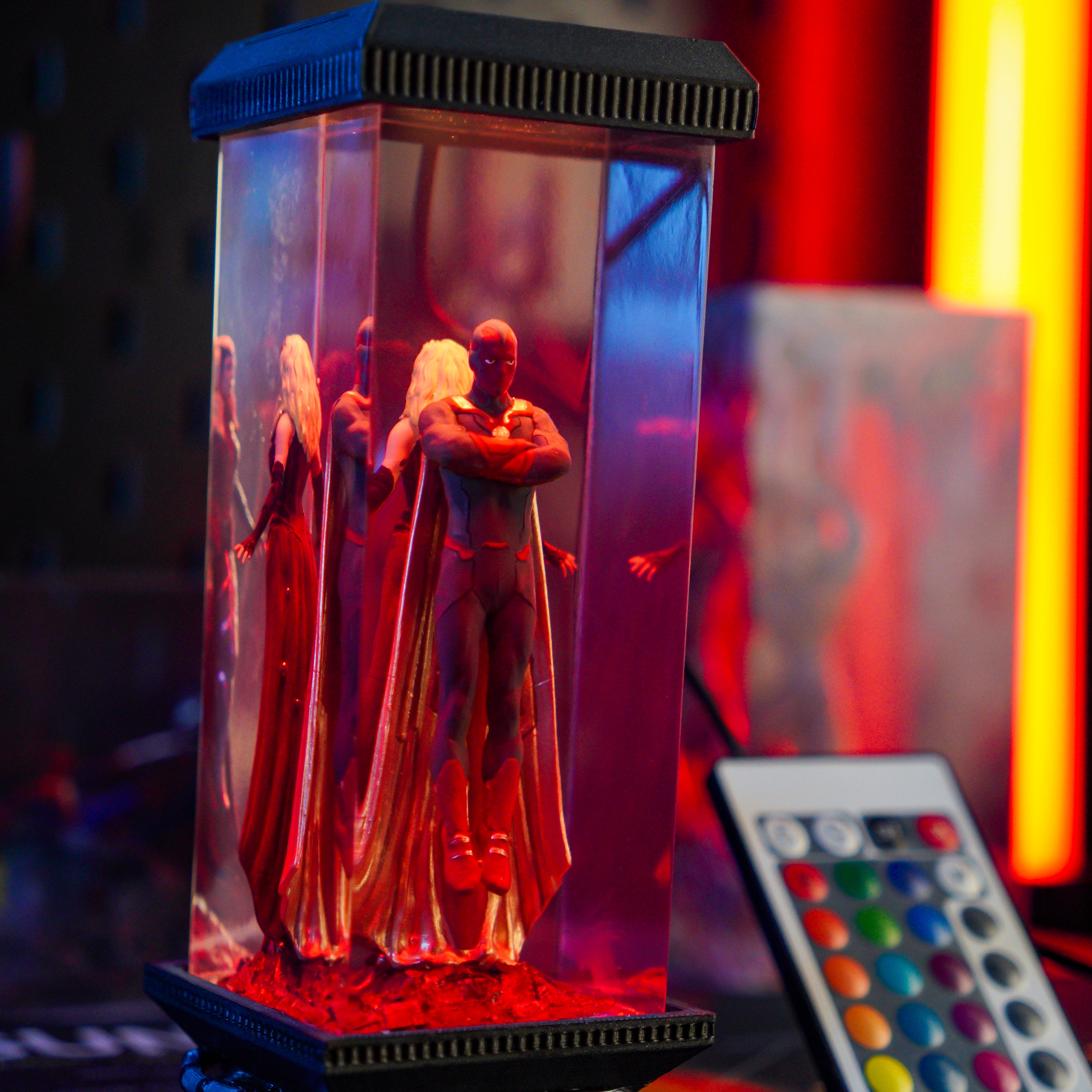 Each Wanda Vision Lamp is meticulously crafted by hand, encasing a finely detailed resin sculpture within crystal-clear epoxy.